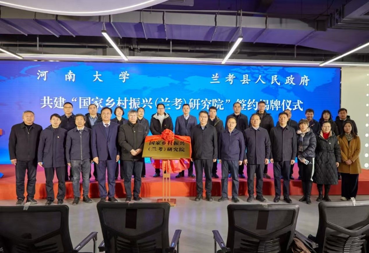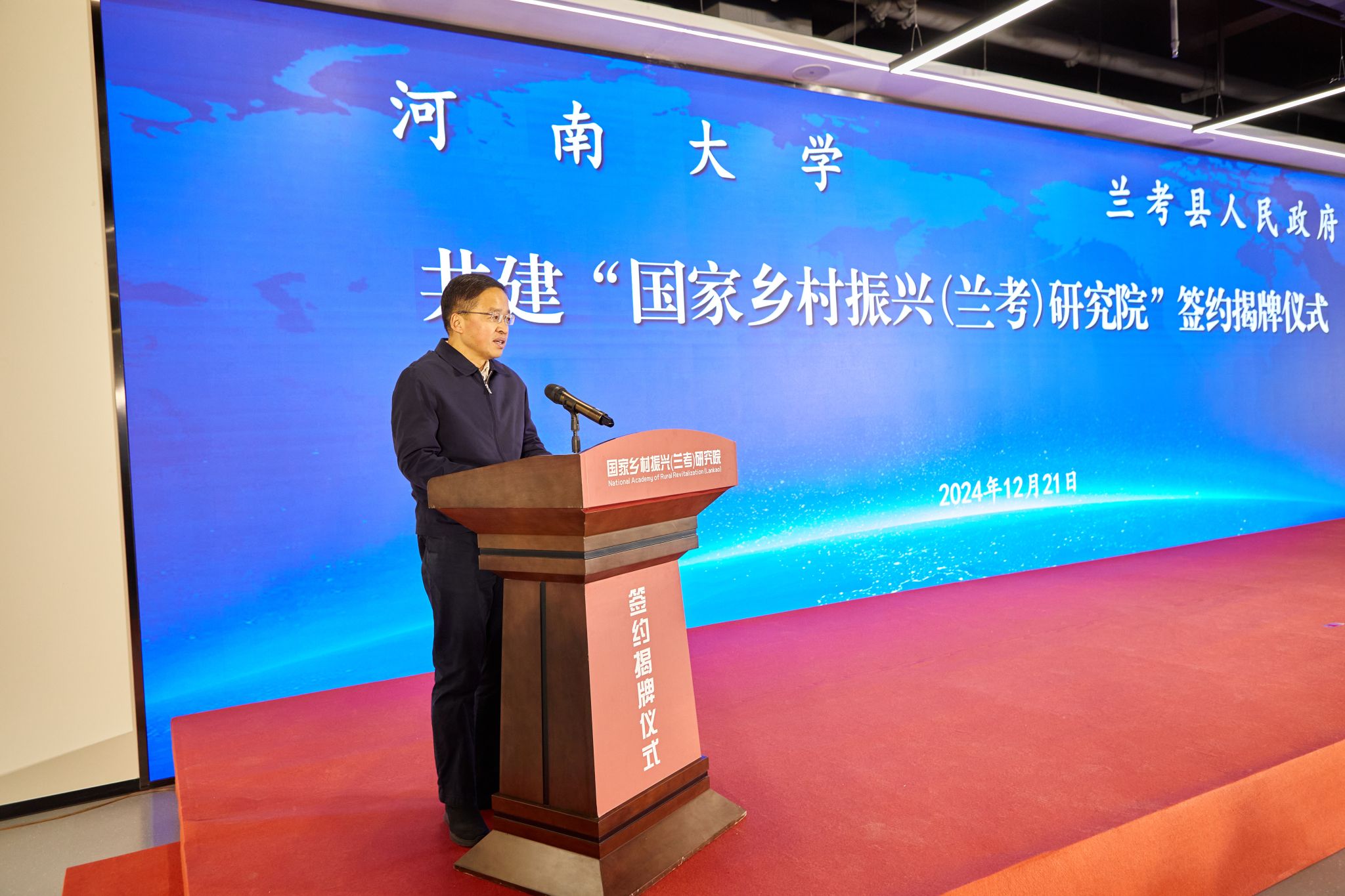 地理科学与工程学部副主任、教育部人文社科重点研究基地黄河文明与可持续发展研究中心主任苗长虹与兰考县委常委、常务副县长张卫波分别代表双方签约。刘彦随与陈维忠共同为国家乡村振兴(兰考)研究院揭牌。