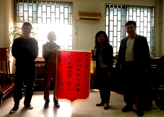 ,为我院赠送锦旗,内容为“你们是爱心使者,将光明送到千家万户”,以感谢和表彰我院学子的志愿行为。参加本次赠旗仪式的有北郊乡团委书记,孙李唐社区代表葛丹丹,成人漫画