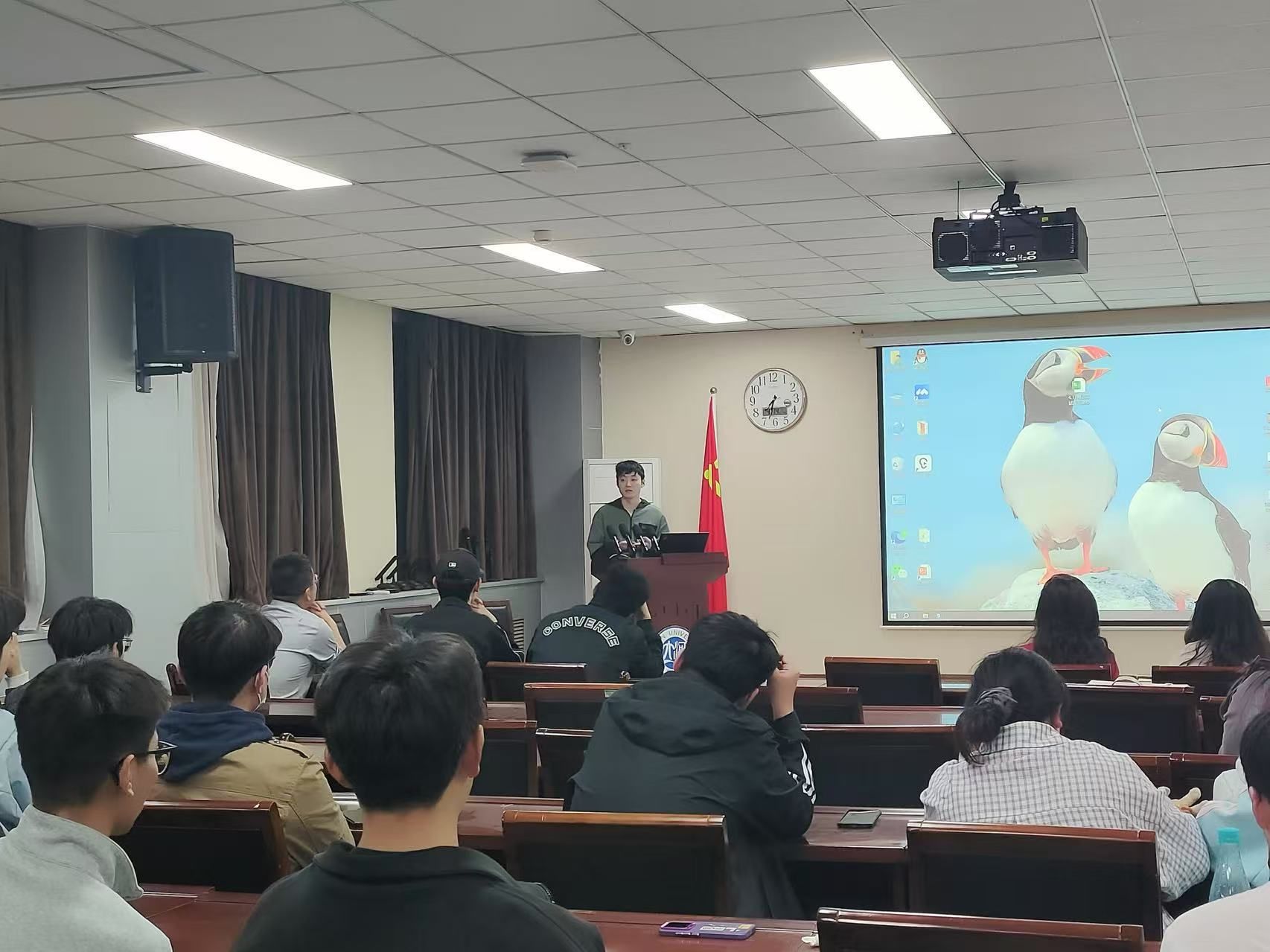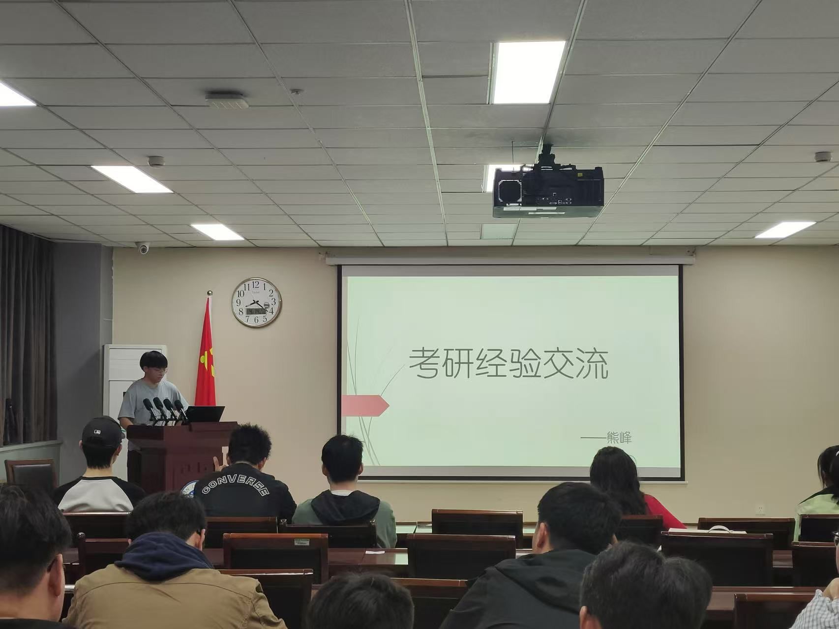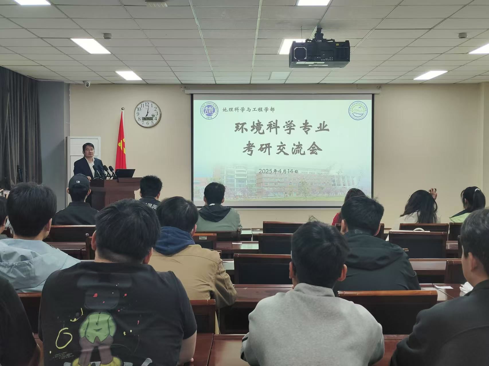 2021级本科生杨姝汀、卢星宇、胡文煊、毕子钧、熊峰、李茜、杨镓旺、王柯岩和郎显赫积极分享升学经验,2022级和2023级环境科学专业学生参会学习,会议由环境科学专业教师李涛主持。