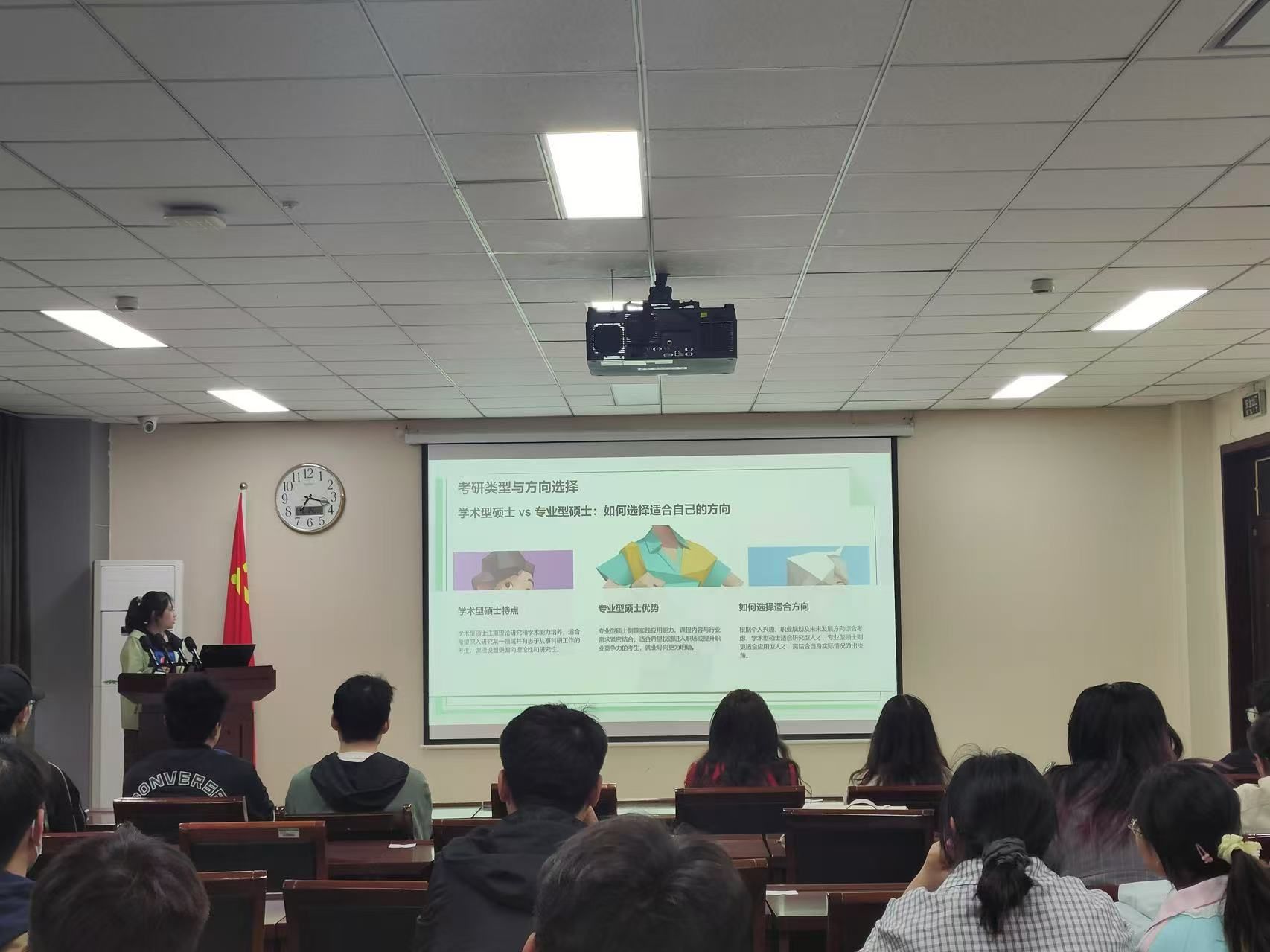 会议伊始,丁志伟对2021级参会学生的升学喜讯表示祝贺并基于自身作为研究生导师的心得感悟向学生们分享了三点经验。他表示,学生在规划读研路径时需秉持对目标院校的诚挚追求,坚守科研初心;同时应保持恒心毅力,持续提升专业能力;此外还要调整心态,以平稳心境适应新环境挑战。他强调备考阶段需全面规划,精准把握复试要点,凭借扎实科研积累和专业基础迎接学术进阶考验。随后,杨姝汀从院校选择、备考计划、学习攻略等方面进行考验经验分享。她认为择校作为方向性决策,需综合个人兴趣、职业规划与学科排名审慎抉择。在备考实操层面,建议学生提前搜集各科目资料,具体而言:政治可依托线上题库强化训练,英语着重提升阅读理解能力,数学需筑牢基础体系,专业课则应多方搜集信息构建知识框架,从而实现科学备考与能力进阶的有机统一。