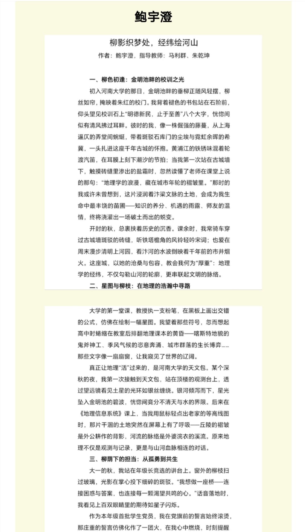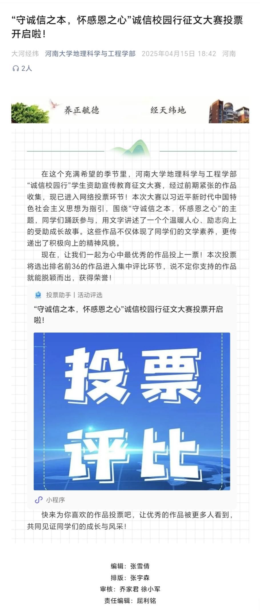 于4月15日至4月17日通过“地理科学与工程学部”微信公众号对征集到的作品进行了线上展示投票。一篇篇真实感人的文字传递着受助学生积极向上的成长力量,也让更多人感受到“资助育人”政策背后的温度与关怀。