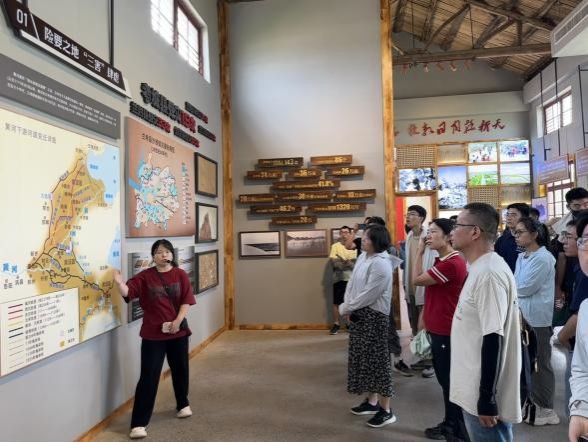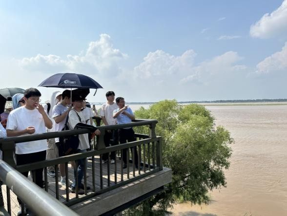 随后,实习队一行奔赴黑岗口,实地考察黄河地上悬河段。吴朋飞为大家讲解了黄河的历史,重点剖析了地上悬河的形成机制与治理难题。他结合黑岗口独特地理环境,介绍了堤防加固、河道疏浚等一系列科学治理举措。师生们对黄河的复杂性与治理的艰巨性有了更深刻的认识,并针对区域内人地矛盾展开了深入探讨。