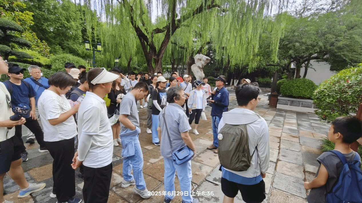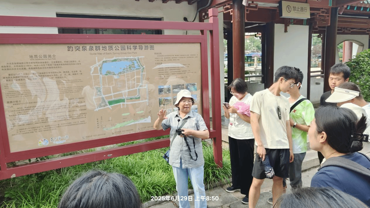 蒙吉军研究员和许学工教授在公园东门处,结合景区绘制的趵突泉泉群地质公园示意图为同学们详细地讲解了济南成为“泉城”的地理条件基础、形成原因及影响因素。济南位于泰山断块凸起与华北凹陷的过渡带,千佛山断裂带与无影山断裂带在此交汇,从而形成了独特的“岩溶水漏斗区”。同时泉水喷涌的磅礴气势与清冽水质,印证了济南喀斯特地貌的水文特征。三股水柱四季恒温18℃,反映了地下岩溶结构的独特水系循环。古泉与历史建筑相映,自然与人文交融,深化了同学们对地理与文化共生关系的理解。此次游览既巩固了专业知识,亦激发了对自然奥秘的探索热情。