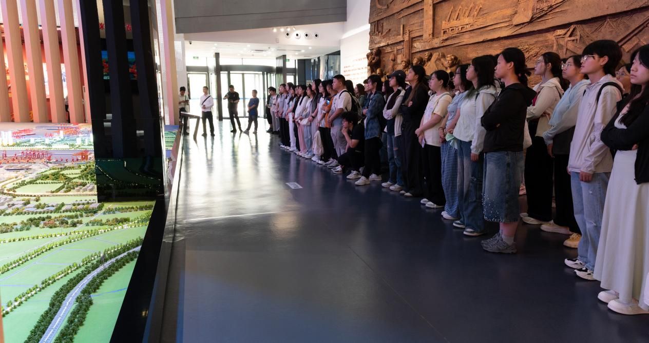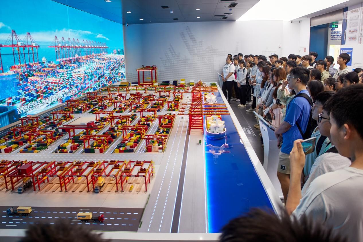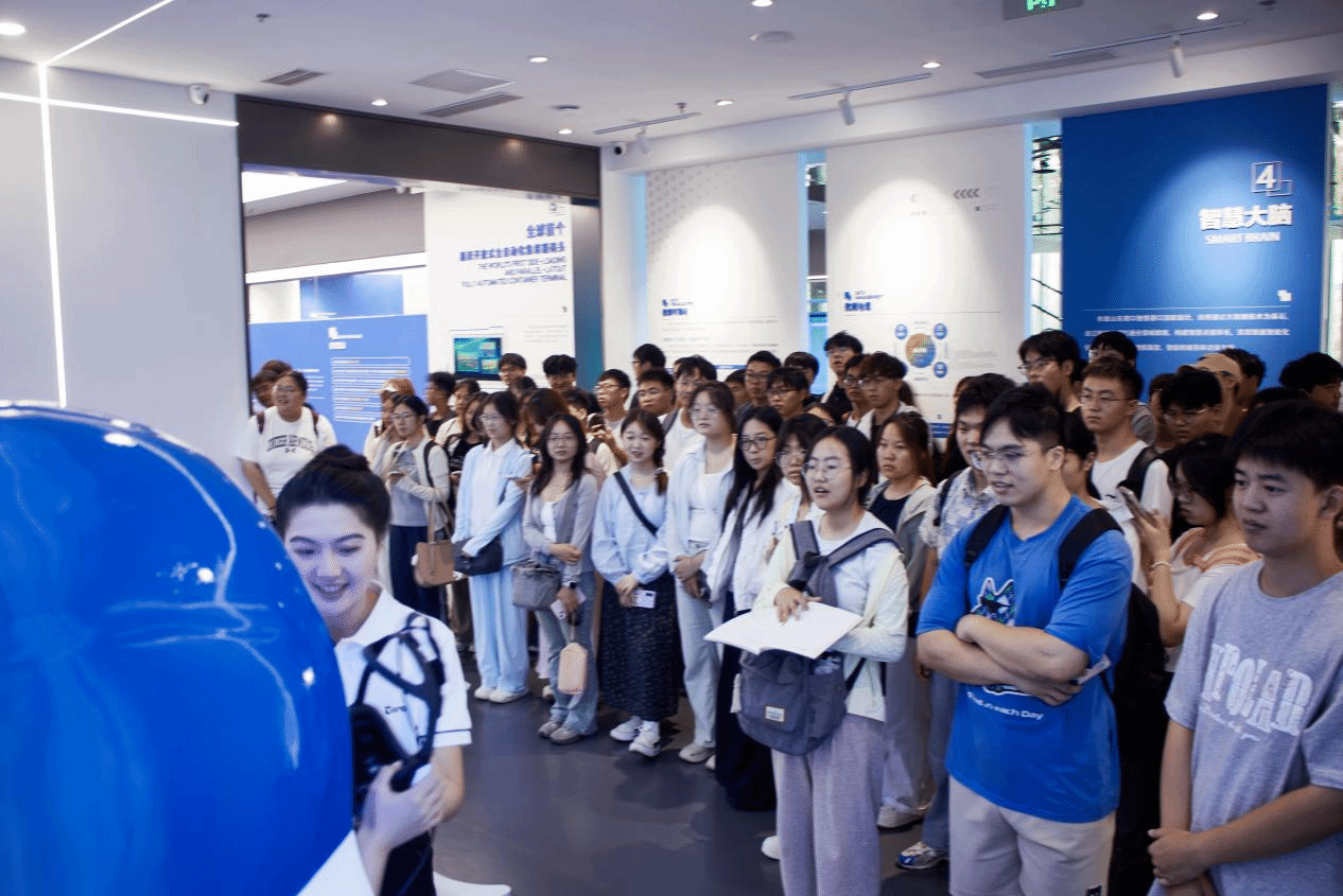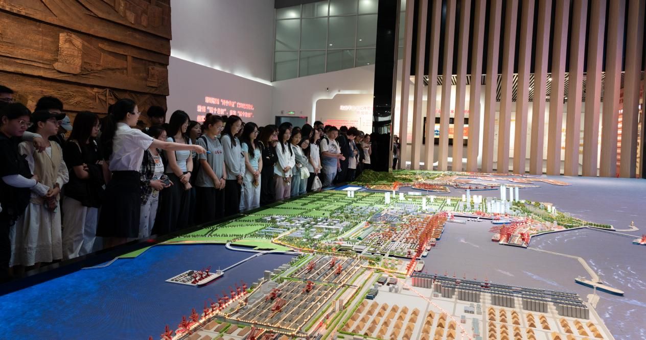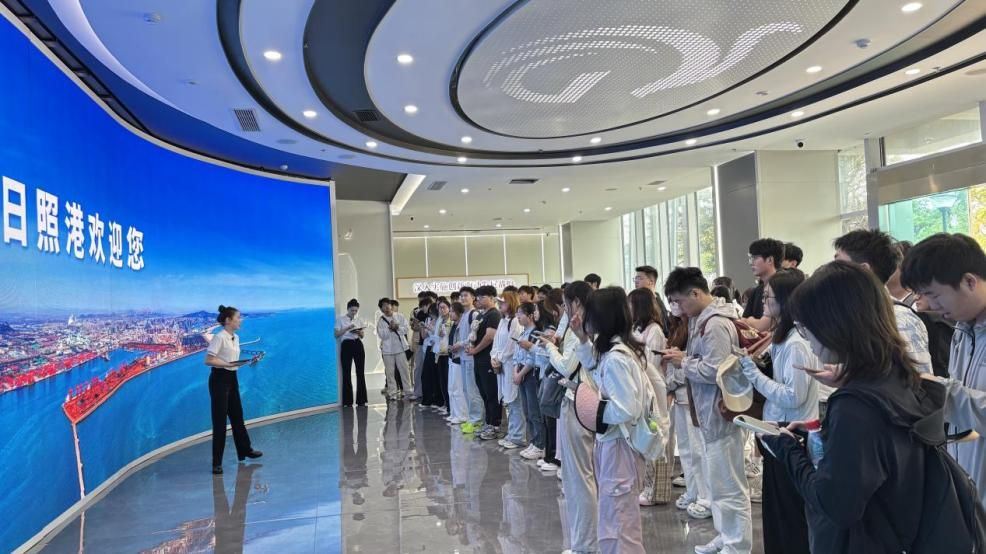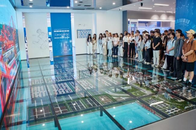 6月27日上午,实习队一行参观了日照港科技馆与日照港展览馆,深入了解了日照港在智能化、绿色化方面的转型成果。在科技馆中,港口机械模型、自动化装卸系统与智慧调度平台等展示了现代港口的核心运行机制。学生们通过VR体验与互动装置等感受到日照港在信息化、系统化管理下的高效运行。随后,实习队来到日照港展览馆通过日照港模型与图文展示等全面了解了它的发展历程、区位优势与功能布局。在展览馆五楼观景平台,学生们现场俯瞰港口作业景象,进一步认识到港口作为海陆交通枢纽,在带动城市空间布局和区域经济发展中的重要作用。