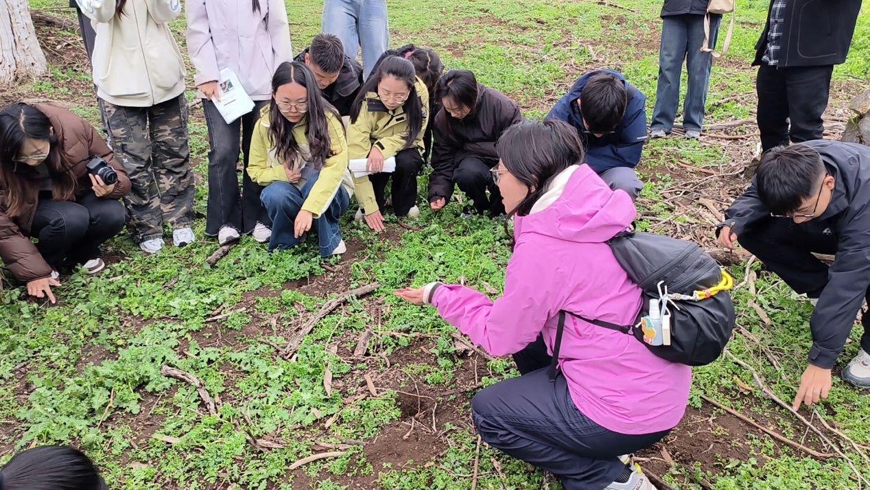随后,实习队前往塔山野生动物保护区(Tower Hill Wildlife Reserve)——一座位于古老火山口的自然保护地。抵达后,带队老师朱文博首先现场开展了土壤地理学的实地教学,引导学生亲手触摸感知土壤特性,深化大家对当地成土过程与地理环境的理解。活动过程中,学生们不仅近距离观察了考拉、鸸鹋等澳大利亚标志性动物,还积极参与原住民文化体验环节。在原住民向导和带队老师的带领下,大家通过聆听传统故事、认识植物用途、观摩狩猎工具演示,从第一视角深入理解了原住民与自然共生的人文传统和生态智慧。最后,带队老师张丽君以当日所见为例,对人地关系理念进行了系统总结与讲解,进一步提升了队员们对人文地理学的现实认知。