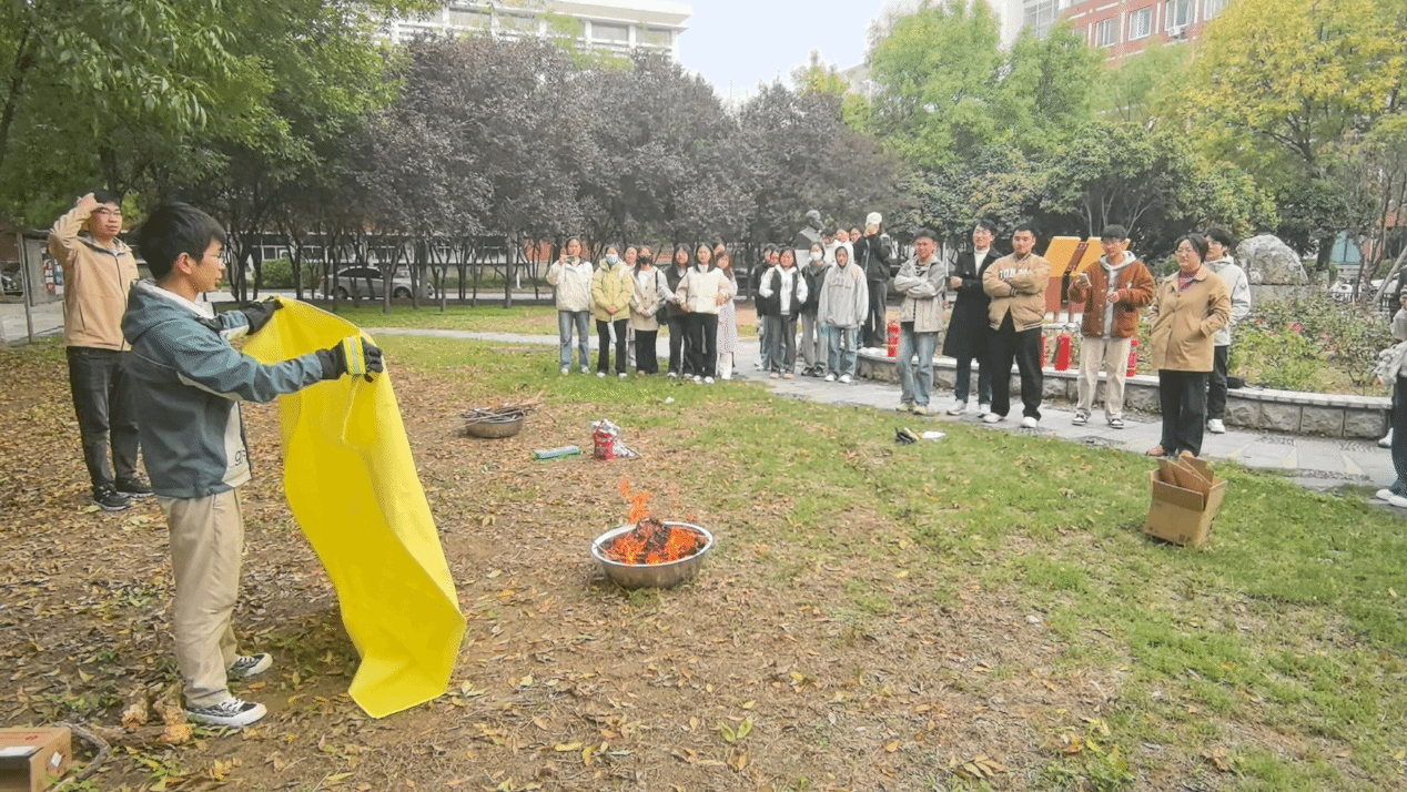 此次演练地点为景兰苑和地学楼6楼,各环节分工明确、衔接有序。在景兰苑演练现场,李天奇老师布设两个实际火源,模拟真实场景,监控演练过程。生态地理实验室的卢二超老师率先开展个人防护演示。他详细讲解护目镜防飞溅、消防面罩防窒息的佩戴要领,纠正“系带过松”“面罩贴合不严”等常见误区。之后,孟凡磊博士向同学们展示灭火毯与消防沙使用方法,通过模拟初期火情,手把手指导如何快速展开灭火毯覆盖火源、规范使用消防沙阻隔燃烧,让大家在实操中理解不同灭火方式的适用场景。