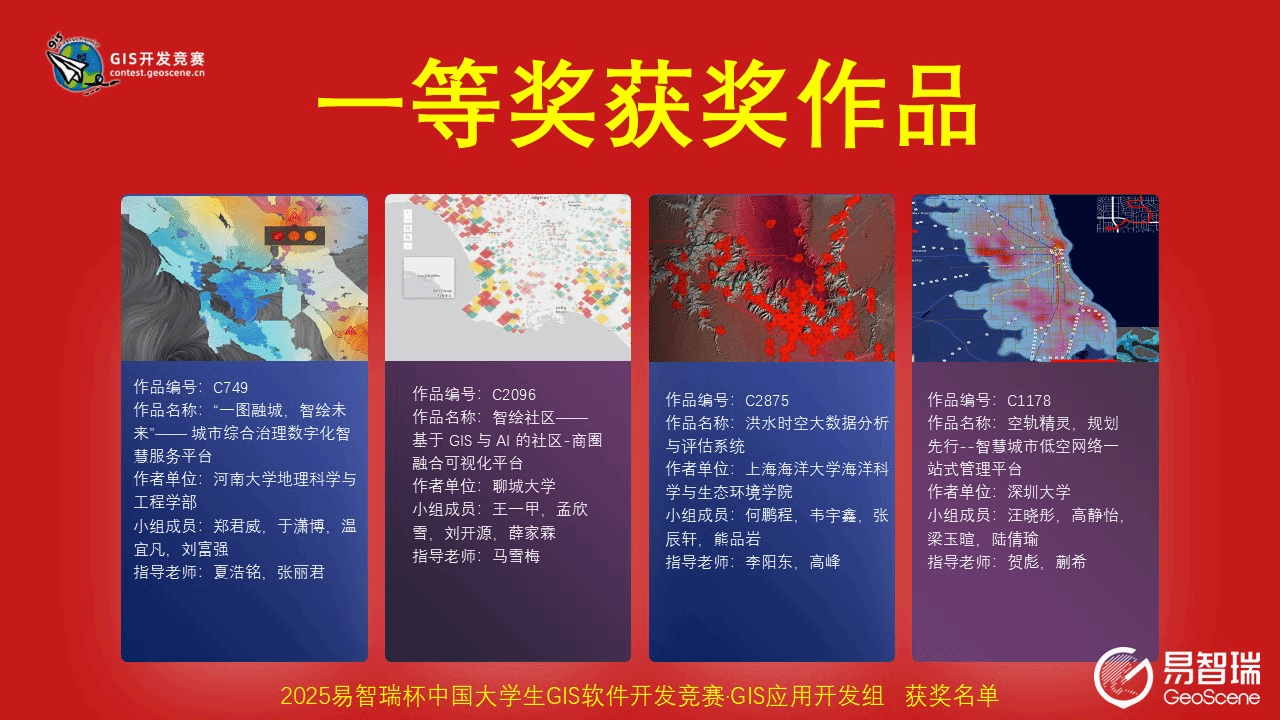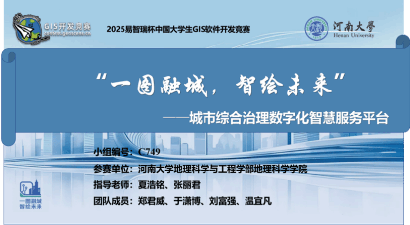 本届赛事GIS应用开发组共征集到86项作品,经过多轮严格评审,最终决出国家级一等奖4项、二等奖6项。由我部学子郑君威、刘富强、于潇博、温宜凡组成的参赛团队,在夏浩铭、张丽君、秦耀辰老师的悉心指导下,并得到往届特等奖获得者汝昱彤、李亚鹏的鼎力协助,凭借作品《“一图融城,智绘未来”——城市综合治理数字化智慧服务平台》,以全场最高分荣获一等奖,连续两年蝉联该组别榜首。