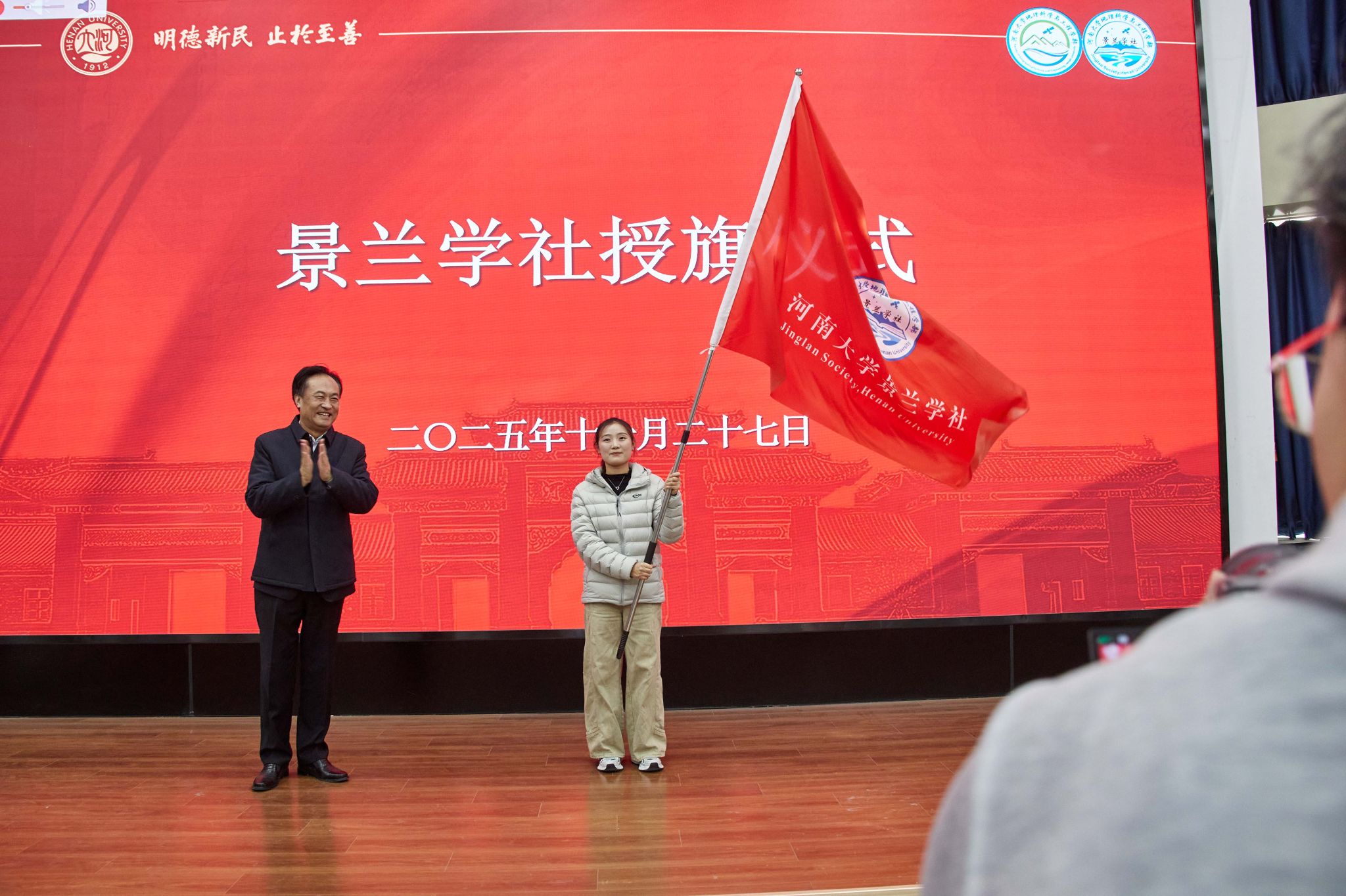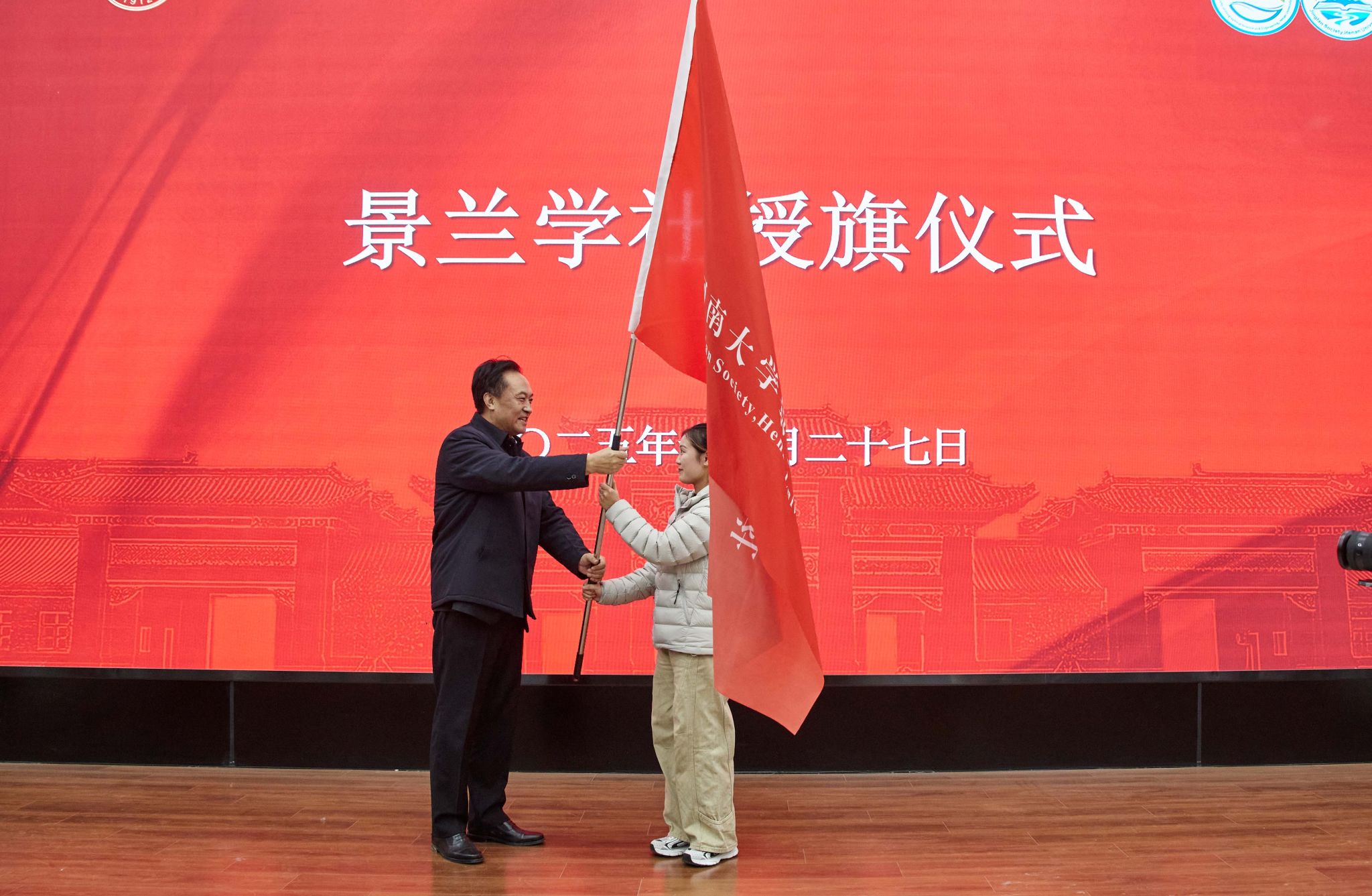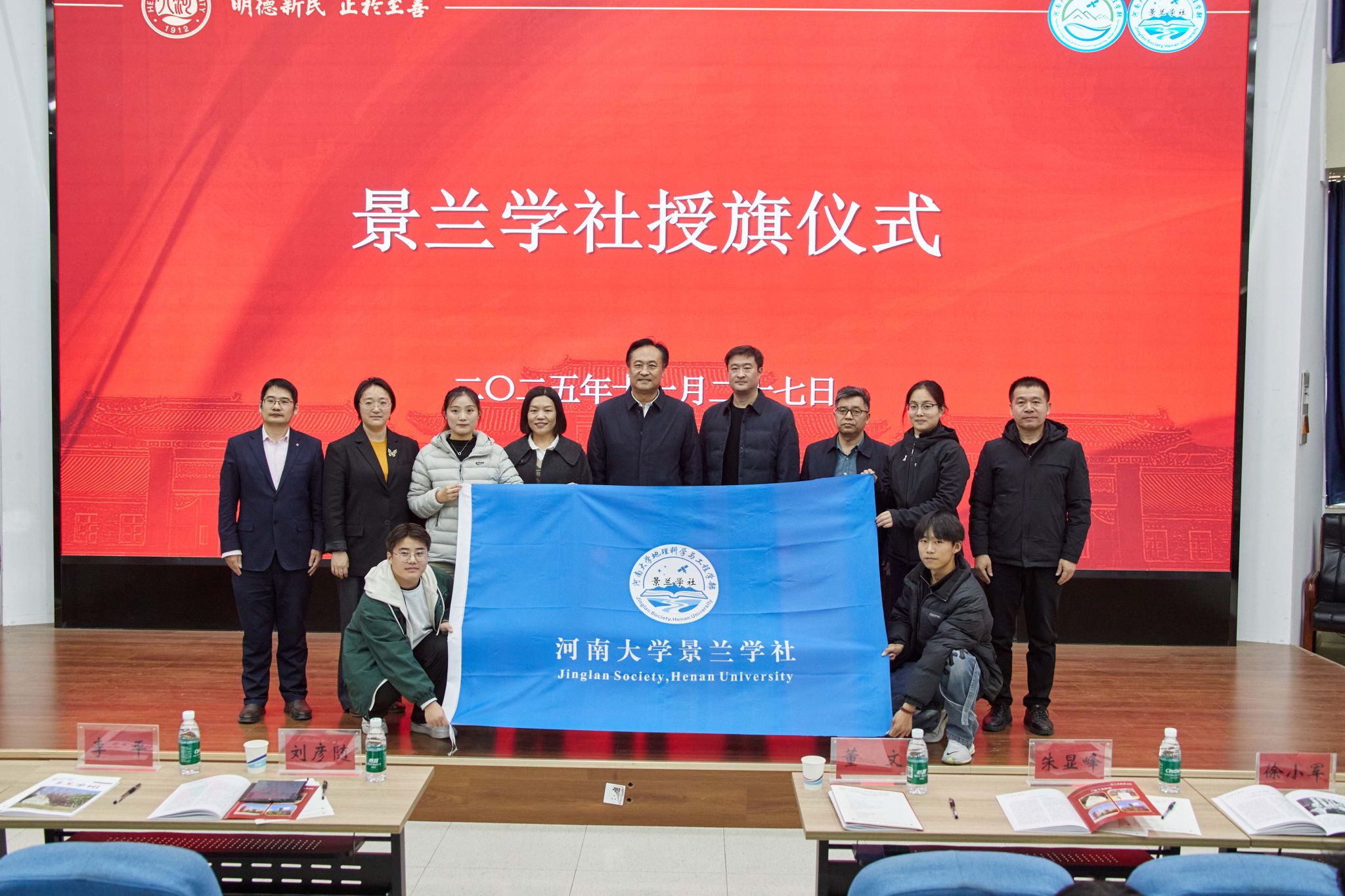 揭牌仪式环节,刘彦随和董文共同为景兰学社揭牌。随后,刘彦随为学社社长授旗,并与学社骨干成员展旗合影。