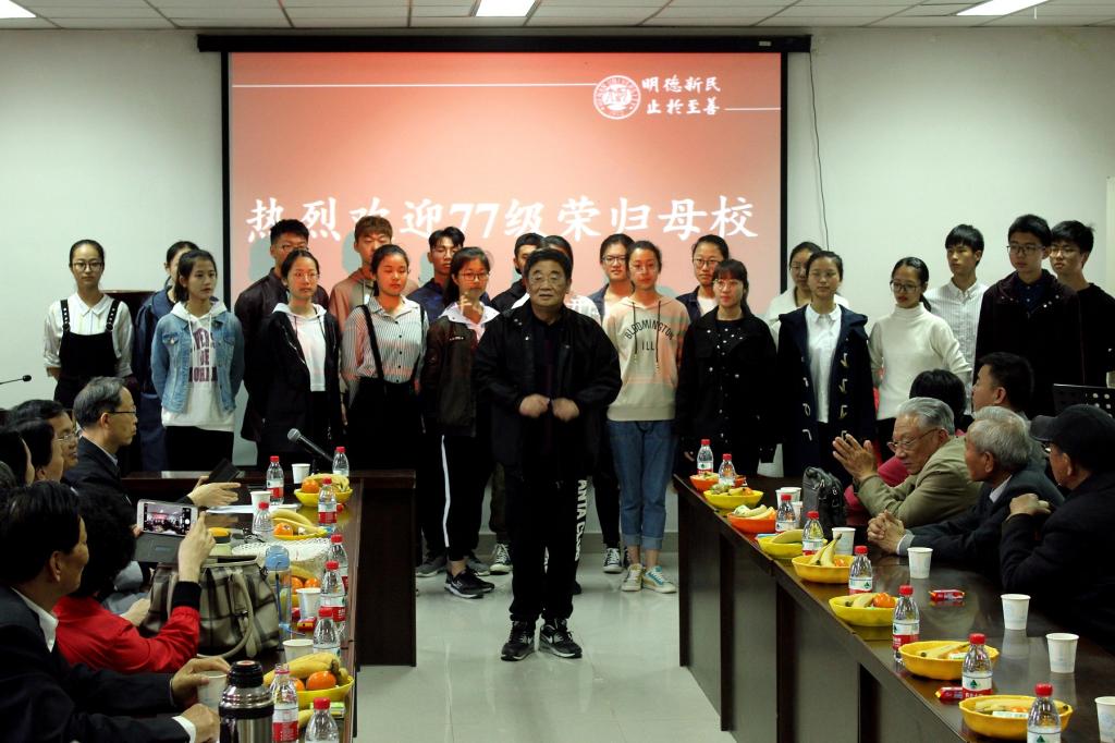 “怀念啊我们的青春啊,昨天在记忆里生根发芽…。”座谈会伊始,校友沈振剑制作精美的PPT影集中展示了77级校友们同窗四年的青春点滴,见证了河大地理系四十年的风风雨雨,时光荏苒,昔日的场景历历在目,校友们不禁感慨万千。“嵩岳苍苍,河水泱泱...”当熟悉的旋律在耳边响起,2017级学生一张张稚嫩的面孔,悦耳的歌声勾起年逾花甲的校友那青葱岁月,王发曾细述起校歌诞生的历史背景,又遥想当年大礼堂合唱比赛地理系学生作为压轴演唱,都是77级校友们珍贵的回忆。