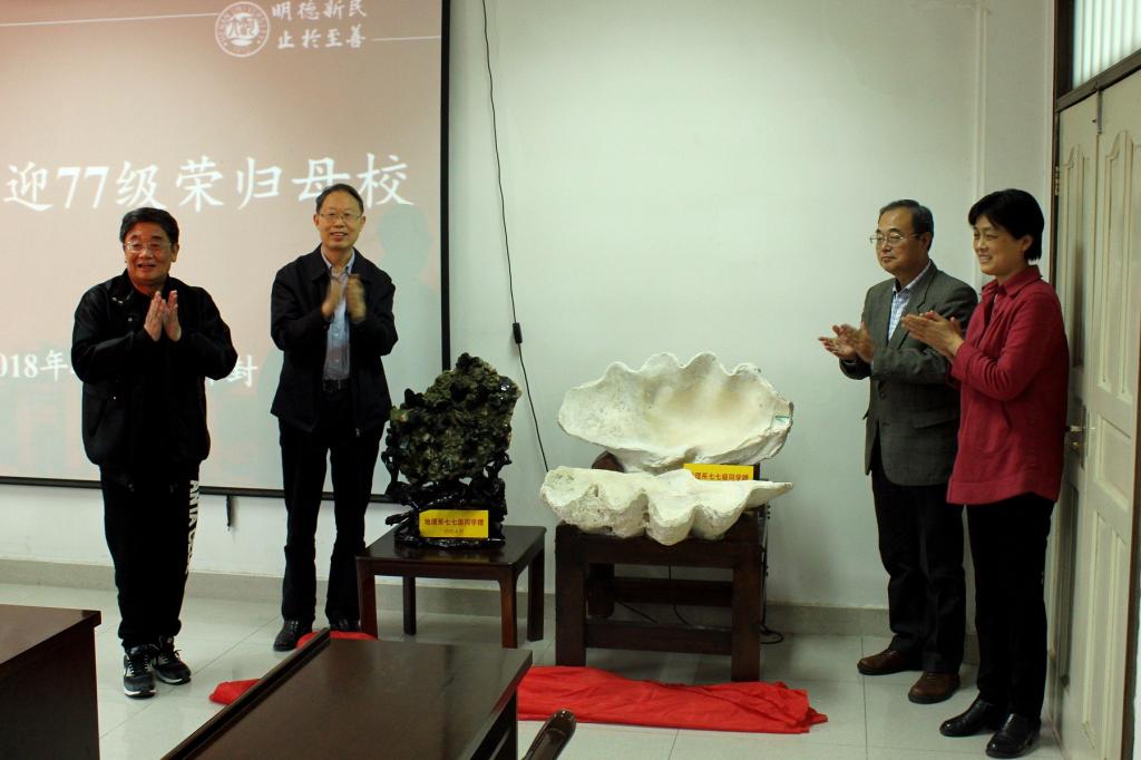 随后,77级校友向学院东英自然博物馆捐赠了墨晶和砗磲岩石标本,学院党委书记闫峻代表学院表达感谢。她指出,四十多年来,77级校友创造的历史、成就的辉煌是不平凡的,捐赠的两块“美玉”是对学院未来发展的期许和支持,也是77级校友在学校里美好的历史记忆,把根留在了河大,学院和校友们将永远血脉相连:正是河大美风景,繁花时节又逢君;依稀风华一少年,青春依旧好时光!