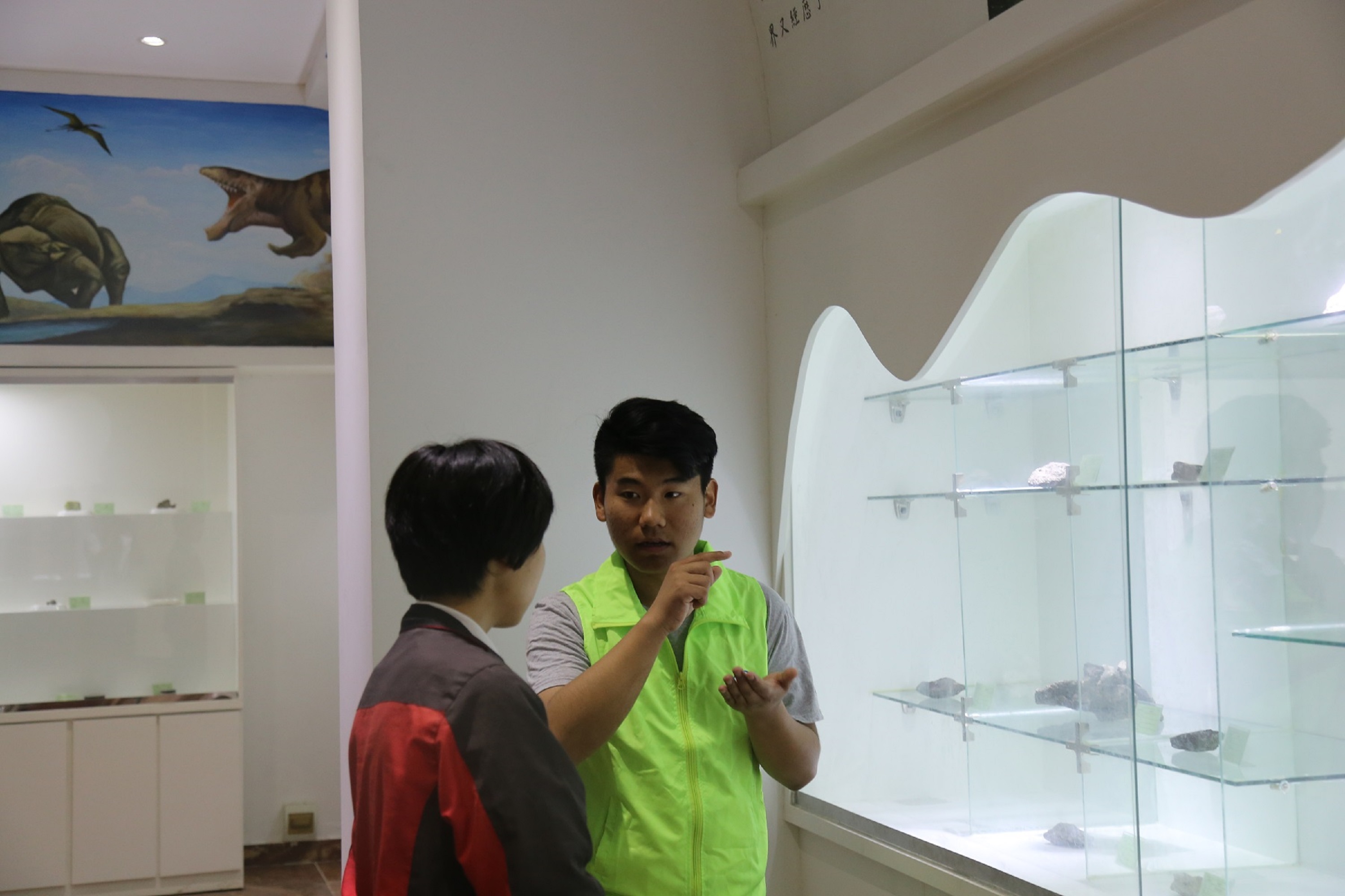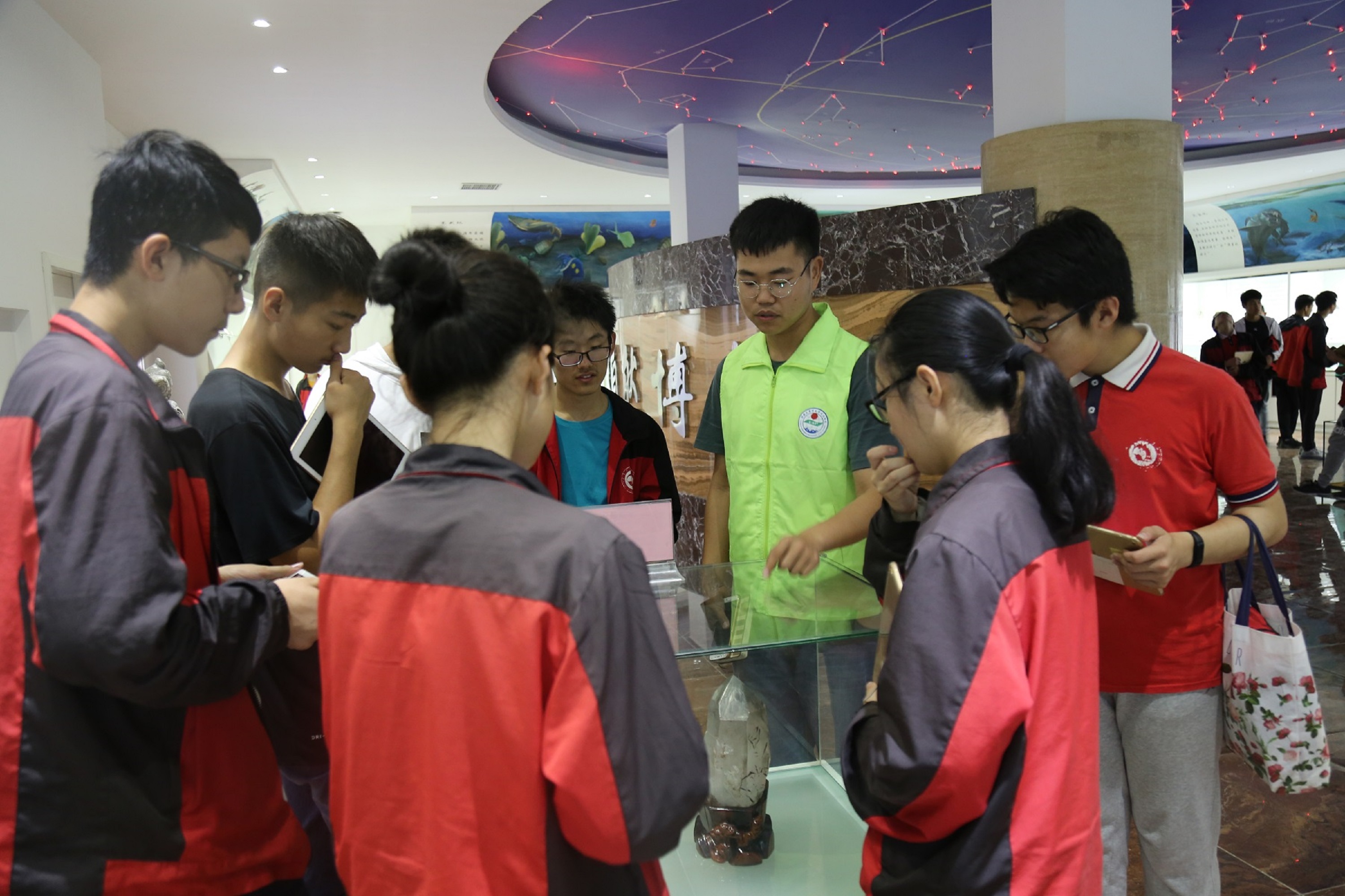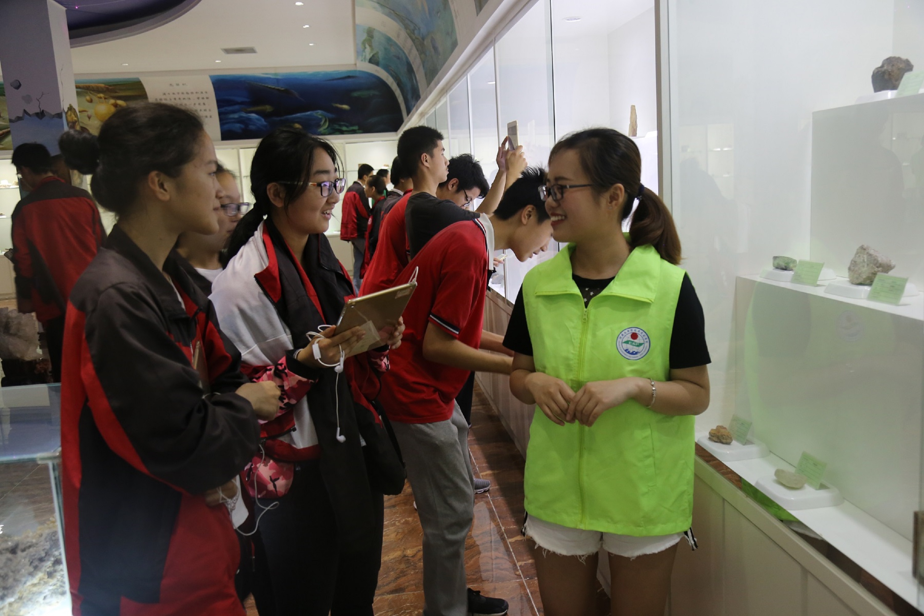 附属中学38名初三学子到东英自然博物馆参观学习。2016级地学实验班四位志愿者为参观者进行讲解,让中学生们对各类岩石、化石以及地球演化历程有了进一步了解。