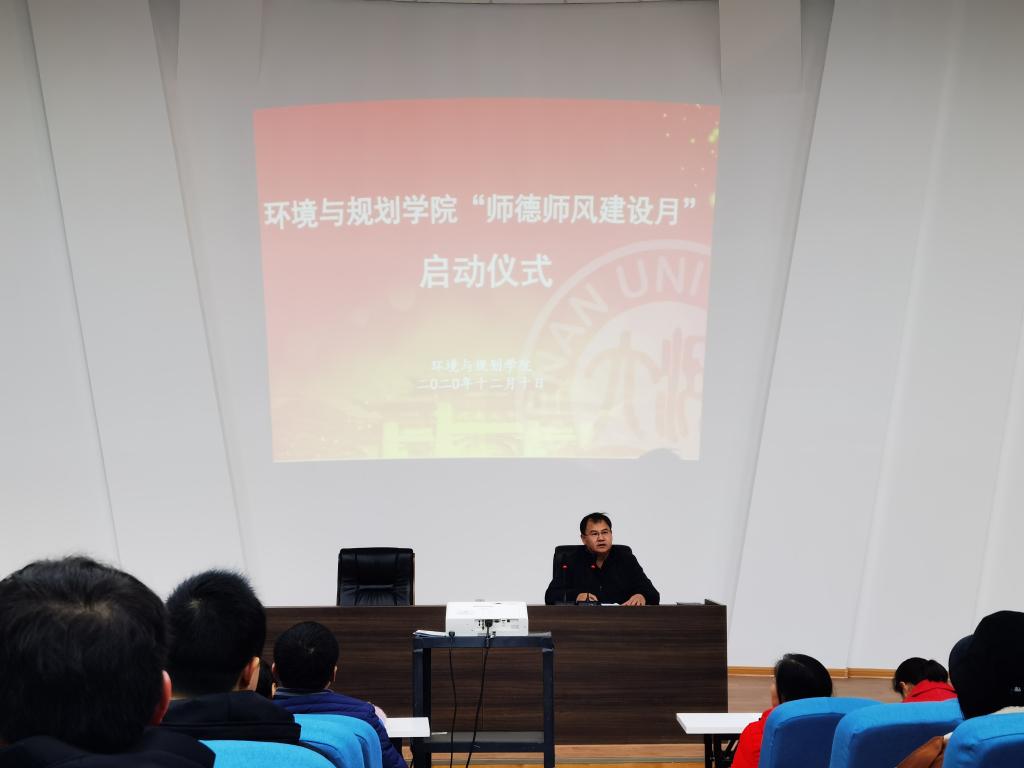 副院长潘少奇传达学校通知,并宣读《环境与规划学院开展“师德师风建设月”活动实施方案》。《方案》强调要认真贯彻落实习近平总书记关于教师队伍论述的要求,以社会主义核心价值观为引领,以“学为人师,行为师范”为准则,以“关爱学生,教书育人”为核心,以践行“师德师风规范,弘扬高尚师德师风”为目标,促进“教师育人为本,德育为先”的教育理念,大力营造立德树人的良好氛围,努力建设一支“四有”好老师队伍。