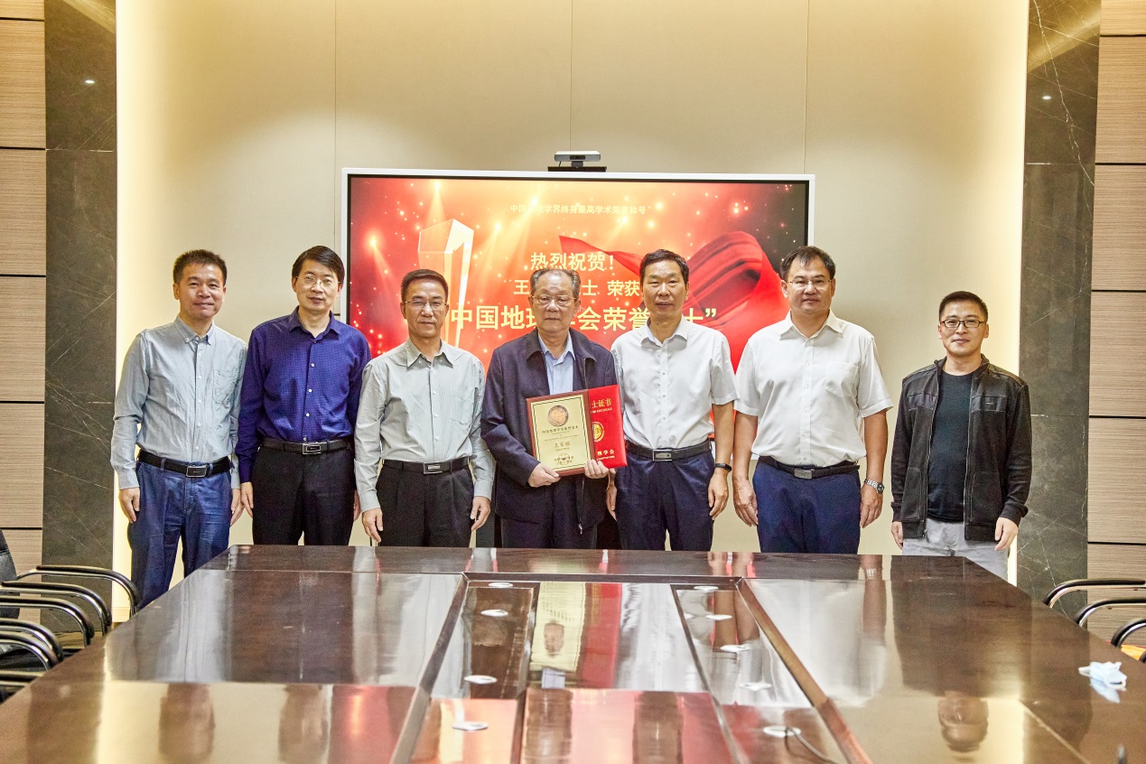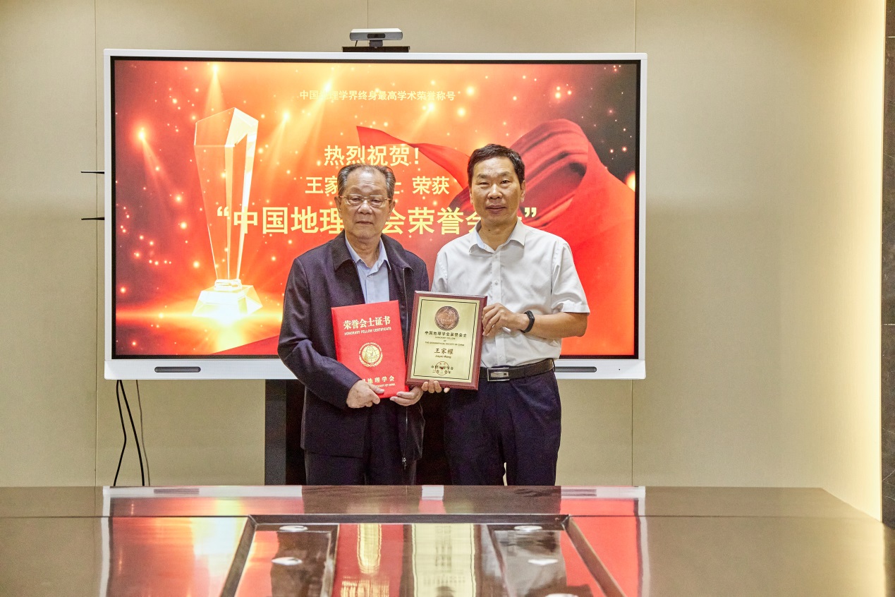 苗长虹受中国地理学会副理事长、秘书长张国友研究员委托,代表中国地理学会为王家耀院士颁发“中国地理学会荣誉会士”证书和匾牌,与会人员合影留念。