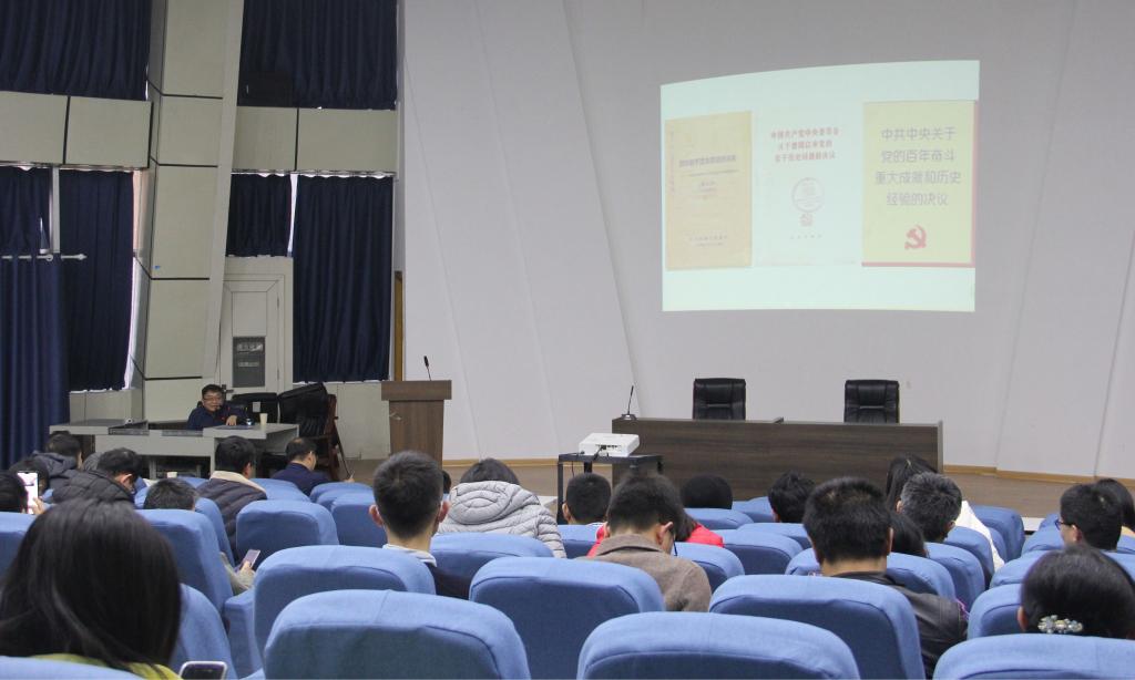 马克思主义学院教授刘德定应邀在锥形报告厅为我院师生作深入学习党的十九届六中全会精神的报告。报告会由党委副书记徐小军主持。