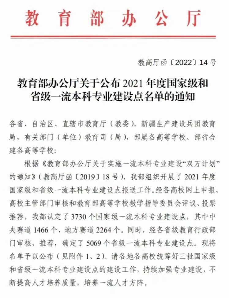 近日,教育部办公厅发布《关于公布2021年度国家级和省级一流本科专业建设点名单的通知》(教高厅函[2022]14号),我院申报的人文地理与城乡规划专业获批国家级一流本科专业建设点。