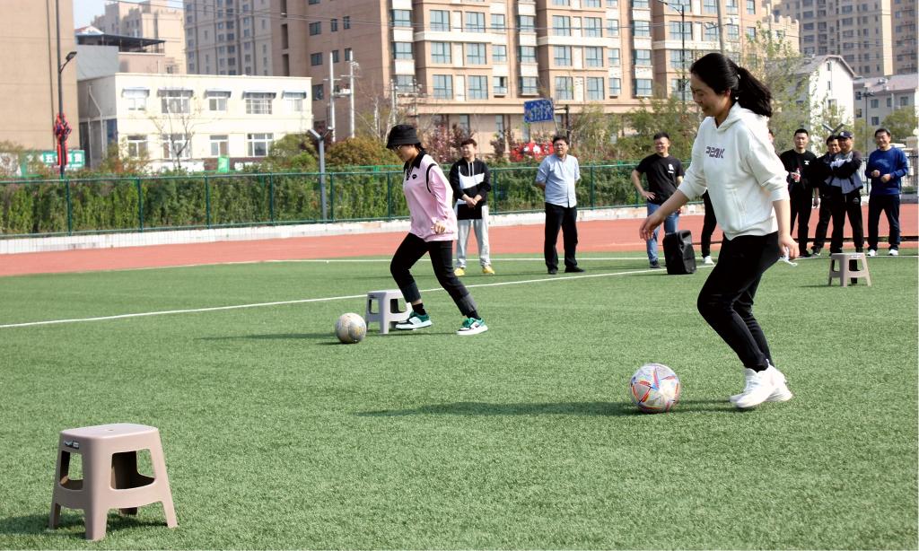 本次运动会共六个项目,分别是盲人摸象、带球绕杆、托球跑、四人五足、实心球掷准和点球大战。各项比赛按名次先后记分,根据比赛的总得分进行排名。赛场上,教师们尽情挥洒汗水,场外观众也时刻关注比赛动向,为参赛教师加油鼓气、呐喊助威,场面欢快热闹,留下阵阵欢声笑语。盲人摸象环节展现了教师对距离预估的准确判断力;带球绕杆项目展现教师们非凡的控球能力;拖球跑环节中更是欢快无比、不亦乐乎,教师们在保证乒乓球不掉落的情况下,火速向前,健步如飞,将球移交给接力队员,尽力缩短小组用时;四人五足的游戏中,教师们以响亮整齐的口号,同心齐步,超越向前,展现出互帮互助,团结协作的精神;最后的点球大战,教师们用一次次精彩的射门为本次趣味运动会画上完美的句号。