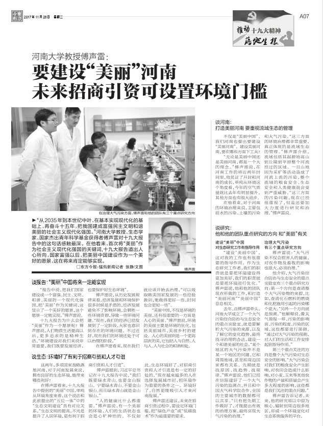 “建设‘美丽中国’,这对我的工作也有很重要的指导作用。作为生态研究工作者,我们的职责就是要把环境建设得更加美好,我们的职责就是要把环境进行优化。”傅声雷说,他和他的团队现在所做的工作,和打造“美丽河南”“美丽中国”息息相关。