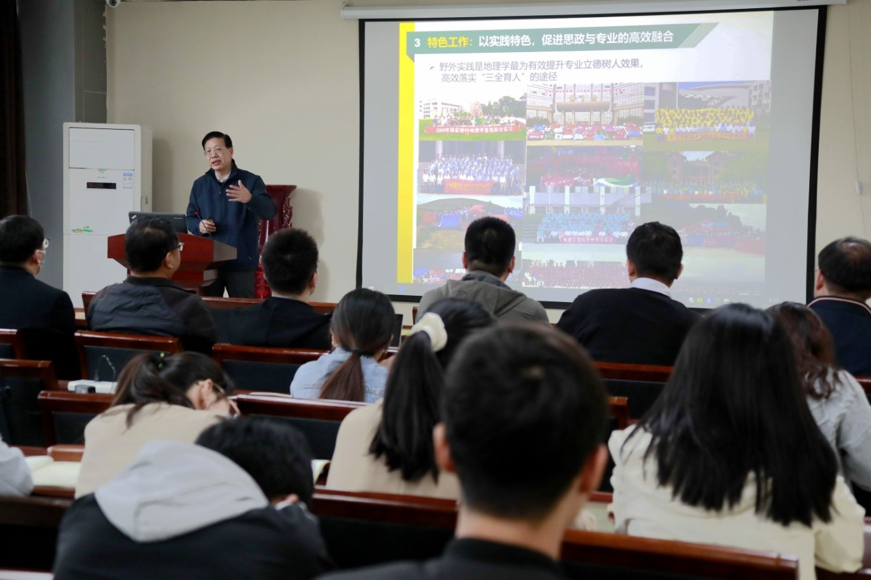 郑祥民教授将课程思政上升到理论高度,提出了思政课、素质课、专业课“三位一体”,师德师风与学生素质“五要素协同”,思政元素“溶盐于汤,惊涛拍岸”,课程思政教育“五目标”等思想和观点,并深入实践,对地理学一流人才培养具有重要指导意义。郑教授的严谨作风,深刻思想,精彩论述,迎来广大师生的赞誉和掌声。