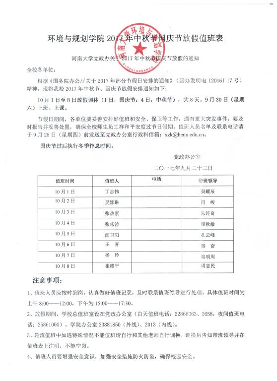 【通  知】环境与规划成人漫画 2017年中秋节国庆节放假值班表