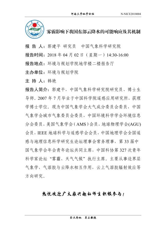 【地学论坛】郭建平:雾霾影响下我国东部云降水的可能响应及其机制(时间:4.02,14:30-16:00)