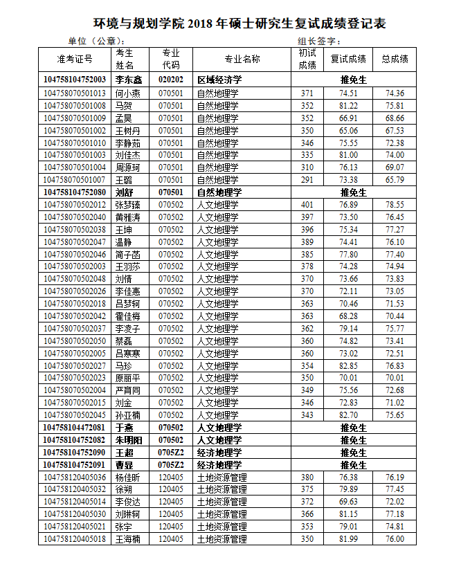 【公  示】环境与规划成人漫画 2018年硕士研究生复试成绩登记表