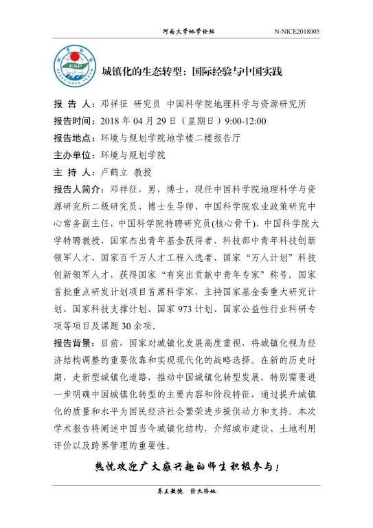 【地学论坛】邓祥征:城镇化的生态转型:国际经验与中国实践(时间:4.29,9:00-12:00)