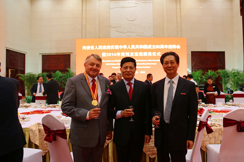 9月29日,河南省人民政府在郑州黄河迎宾馆举行庆祝中华人民共和国成立65周年招待会暨2014年“黄河友谊奖”颁奖仪式。省委副书记、省长谢伏瞻发表热情洋溢的致辞并为获奖者颁奖。校长娄源功、成人漫画海外讲座教授,捷克国际欧亚科成人漫画