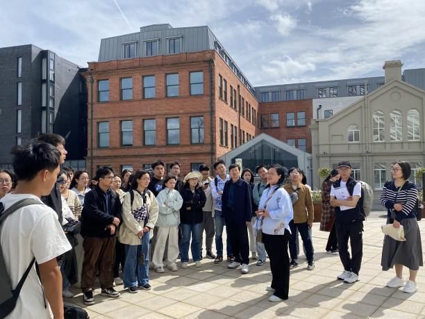 行程最后,师生一行参观了贝尔法斯特的地标性建筑——阿尔伯特纪念钟塔(Albert Memorial Clock Tower)及“知识的三文鱼”雕塑(Big Fish)。阿尔伯特纪念钟塔因其显著的倾斜而闻名,被称为“贝尔法斯特的比萨斜塔”,该现象与海滨城市不可避免的地面下陷有关,揭示了城市地质条件对建筑结构稳定性的影响,同学们在实地观察中,直观认识到了地质学、建筑学与城市规划之间的紧密联系。“知识的三文鱼”雕塑,不仅是贝尔法斯特的旅游标志,也是城市的文化符号,为同学们探讨文化地理学中公共艺术与城市文化形象塑造的关系提供了一个绝佳的学习案例,进一步理解了地理学在文化表达和城市形象塑造中的作用。