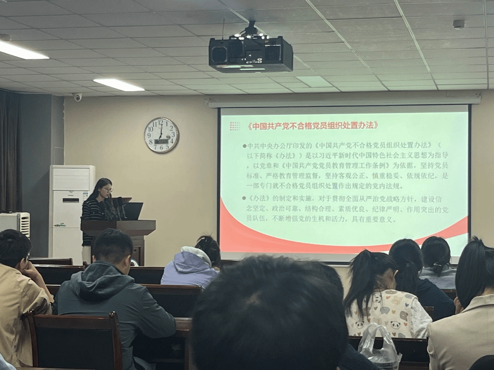 会议第一项,由支部组织委员邬方莉带领参会同志学习关于《中国共产党不合格党员组织处置办法》的相关内容,她着重强调了党中央制定不合格党员组织处置办法,是我党落实全面从严治党、加强党员队伍建设的具体举措,对于保持党的先进性和纯洁性具有重要意义。作为学生党员要充分发挥先锋模范作用,积极向身边的优秀党员学习,争做合格共产党员。与会党员围绕“如何在实际学习、工作、生活中践行高标准党员要求,避免成为不合格党员”展开了热烈讨论。