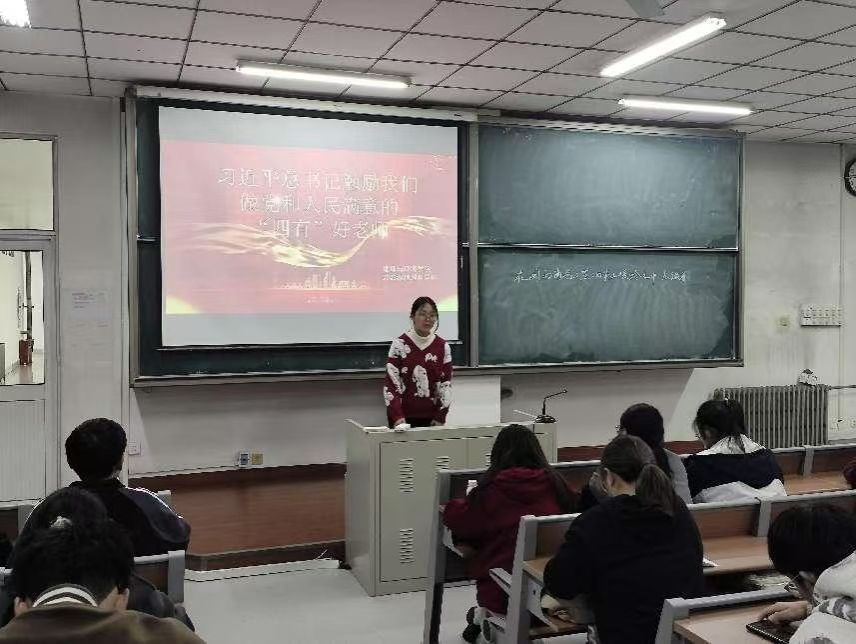 活动伊始,刘星羽讲述习近平总书记在教师节去到北京师范大学看望师生所提出的“做党和人民满意的‘四有’好老师”,随后,他通过一段影片阐述习近平总书记的教书育人观,进而引出“四有”好老师的四点要求是有理想信念、有道德情操、有扎实学识、有仁爱之心,最后,各位团员与入团积极分子积极发言,讲述自己的见解,提出在当今时代中如何做好“四有”好老师。