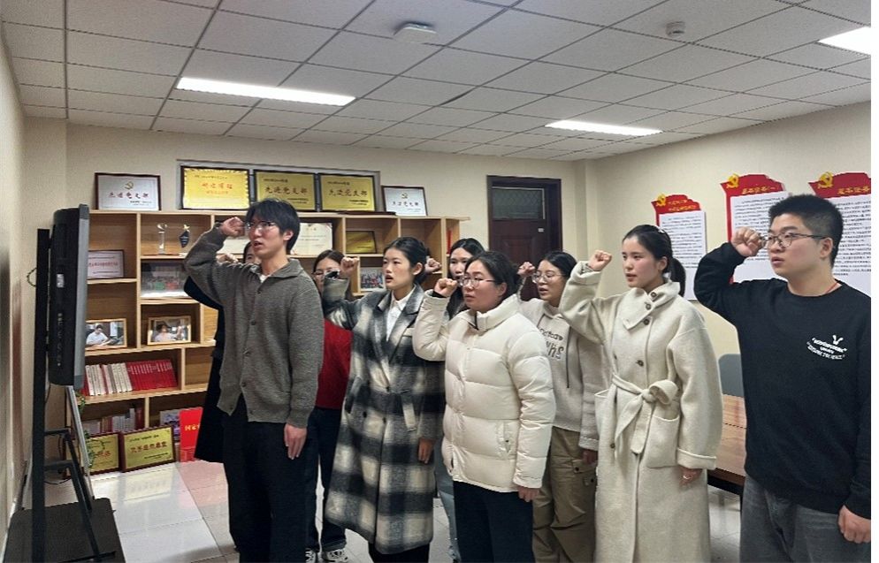 两位入党介绍人就发展对象的考察情况向参会同志做了详细报告,并对其能否入党表明意见。随后组织委员邬方莉同志代表支部委员会,向支部大会报告了发展对象政治审查的相关情况。参会的党员同志对7名发展对象的入党问题进行充分讨论,并通过无记名投票的方式进行表决。经监票人张航,计票人崔凯龙现场统计表决票结果,大会同意接收王志新、朱孟杰、刘雅萱、杜津津、张文文、呼明慧、霍雪晨7名同志为中共预备党员。最后,预备党员在史靓潇的带领下,面对党旗郑重宣誓,重温入党誓词。