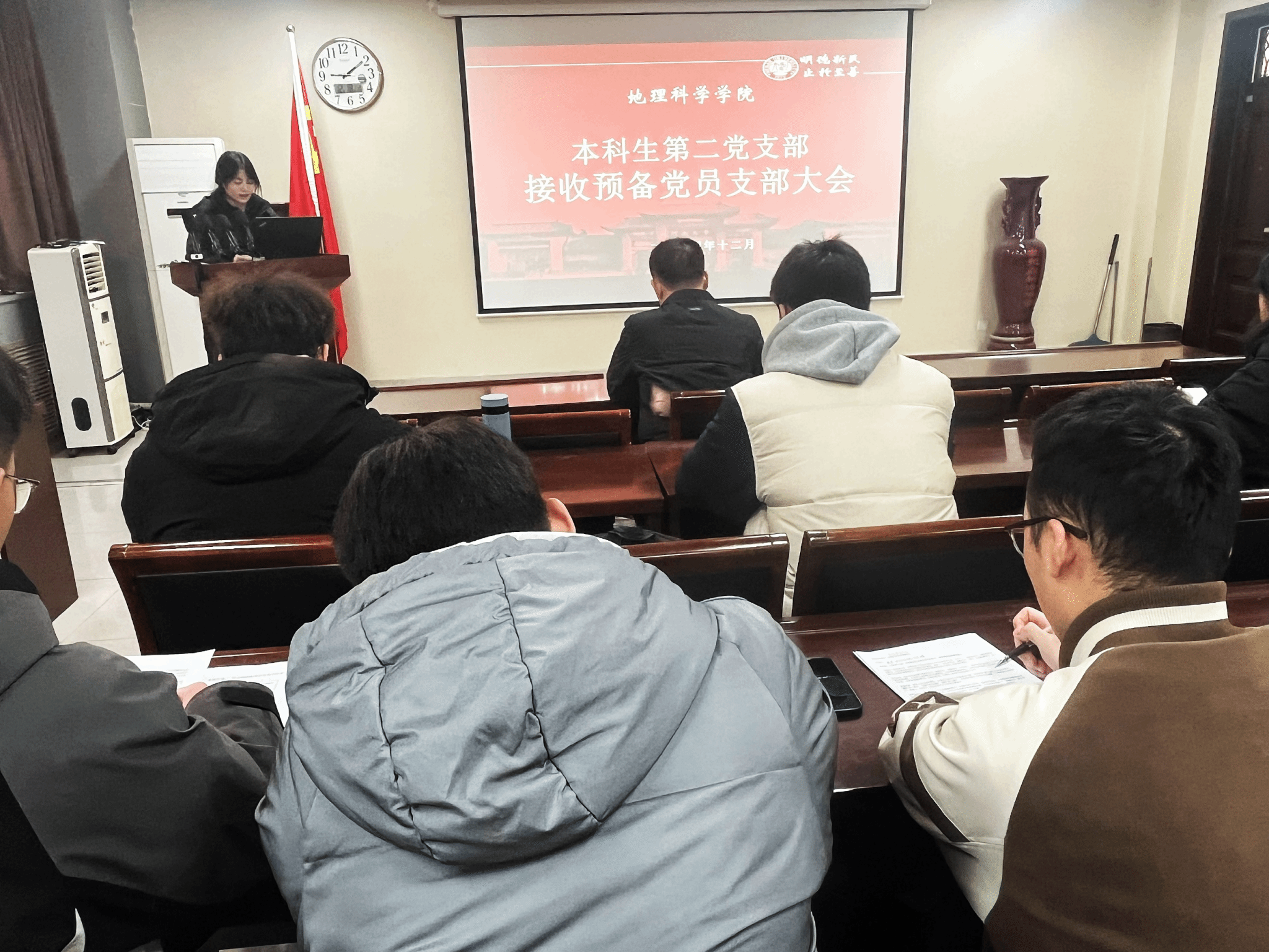 以高质量党建引领一流大学建设的实施意见》的精神(以下简称《实施意见》),12月10日上午,我院本科生第二党支部于地学楼二楼学术报告厅召开专题组织生活会暨接收预备党员支部大会。会议由支部宣传委员马利群主持,支部全体党员及发展对象积极参与。