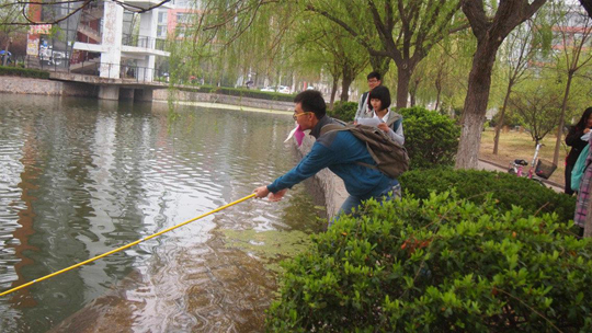 在此次活动中,环境科学团支部共分为四个小组,每组成员分别在组长的带领下科学布点、合理采样,在校内外进行水质监测相关活动。其中两个小组分别前往开封旅游胜地——金明池、包公湖调查景观水的污染状况,另外两组则分别对新老校区的校园内景观水进行监测,切实体现了同学们关注身边水资源质量安全的意识。之后,大家把采集的水样收集起来,并保存在实验室,用离子色谱仪等精密仪器进行检测,并按国家标准测定水的质量情况,整理出相关水样情况调查表以供后期实验研究所用。
