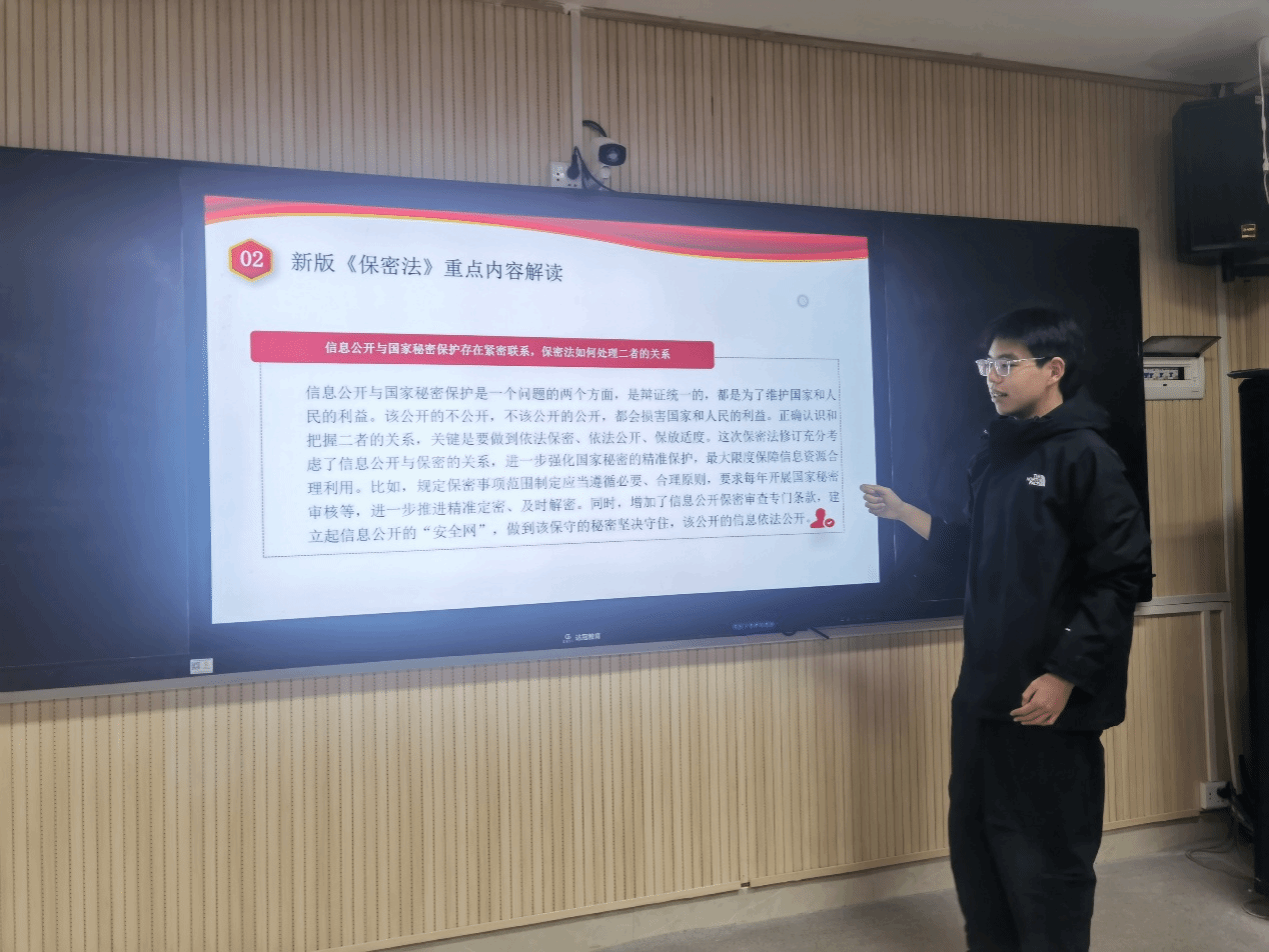 活动首先进行专题领学。支部宣传委员赵祥臣系统解读了新修订的《中华人民共和国保守国家秘密法》的核心要义,重点围绕国家秘密范围、定密权限、保密管理措施及法律责任等关键内容展开。讲解紧密结合高校科研与日常管理实际,着重明确了在学习、科研及工作中如何准确识别、规范处理与安全保管敏感信息,为全体党员划清了行为规范与底线红线。