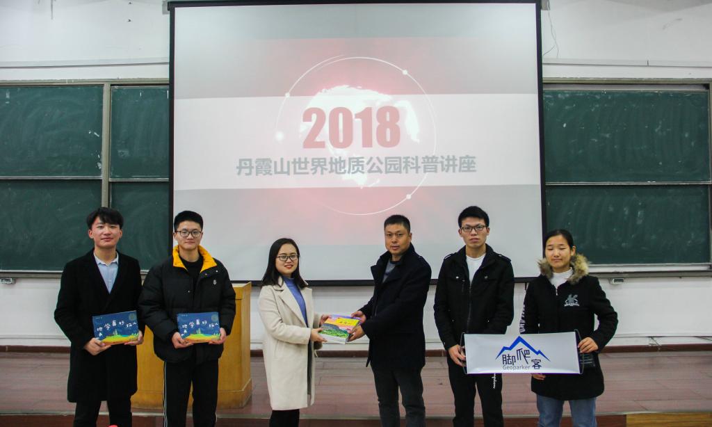 讲座开始前,脚爬客(武汉)信息技术有限公司向我院团委学生会捐赠《奇美天成丹霞山》和《地学真好玩》等共计八本科普图书。随后,2018年丹霞山世界地质公园科普志愿者陈金龙给参加本次讲座的同学们分享了他和丹霞山的故事,进行了有关“丹霞地貌”地学知识的科学普及。同时,在讲座过程中,他提出并倡议大家:“作为新时代的年轻人,特别是地理人,我们应当具有更强的环境与生态意识,并主动承担起更多的社会职责,多走出去,参与到实践当中,做到读万卷书,也要行万里路。”伴着阵阵掌声,本次讲座最终圆满落幕。