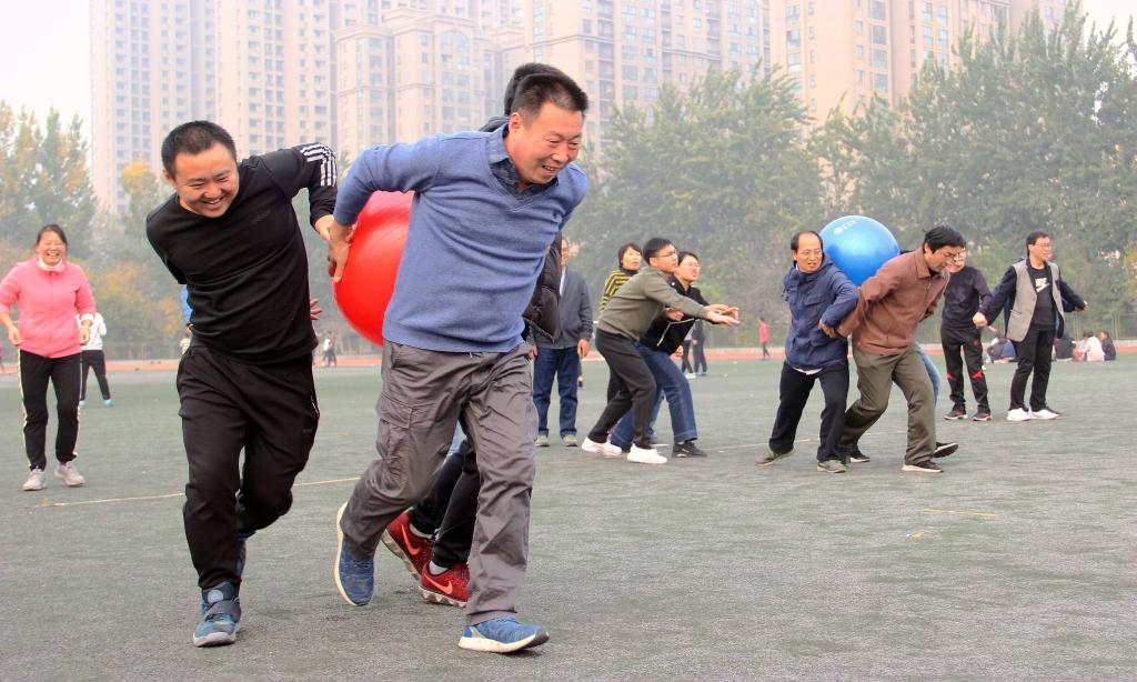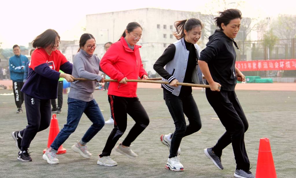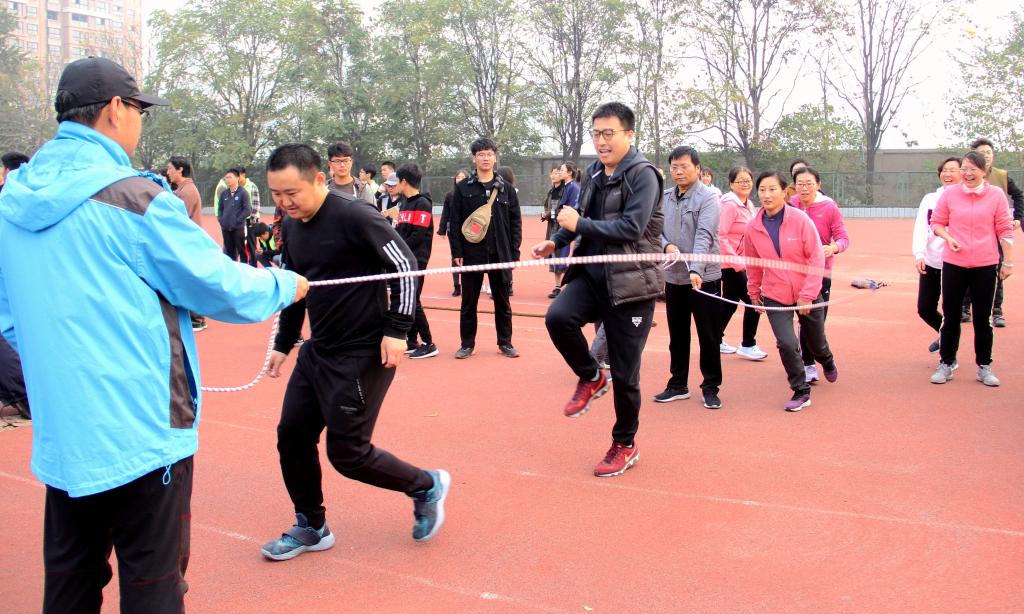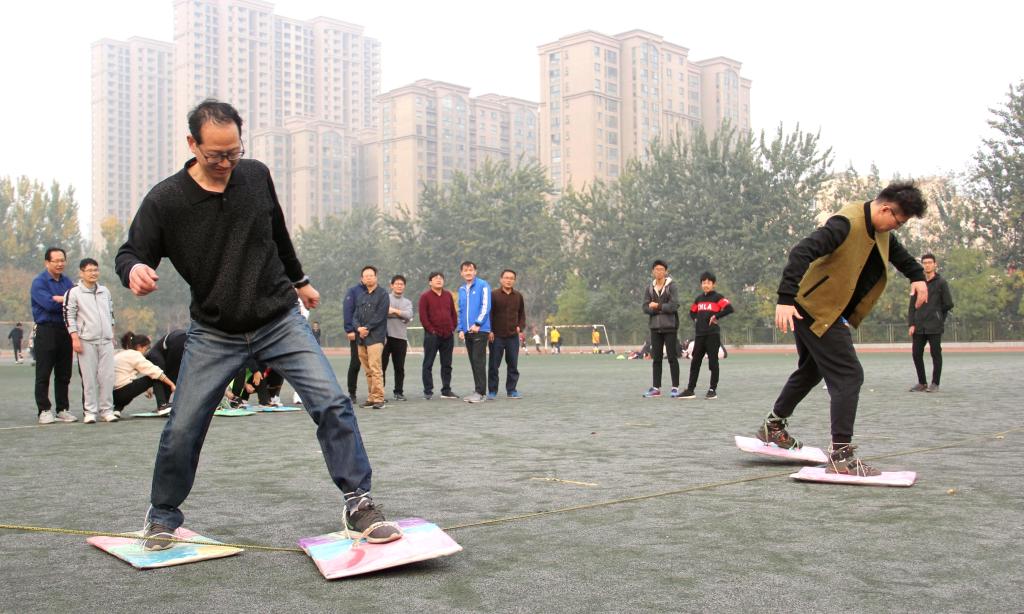 本次运动会设有穿越呼啦圈、带球绕杆接力、巧划旱船、脚踏实地、勇夺三军和三分钟跳大绳共六项团体竞技项目。院长傅声雷就本次活动做了简要介绍,老师们斗志昂扬,磨拳擦掌。在巧划旱船项目中,行政组教师们总结经验采用了“左右口号前进法”,以口号来规范步伐,组成的长龙整齐划一的快速前进,斩获该项比赛的第一名。在随后的脚踏实地和勇夺三军比赛中,老师们将竞技体育的精神与趣味运动的欢乐发挥到了极致,展现出走下讲台精神抖擞、智力与体力相结合的另一面风采。同学们也为老师高声加油呐喊助威,现场欢声笑语此起彼伏,将运动会气氛推向高潮。