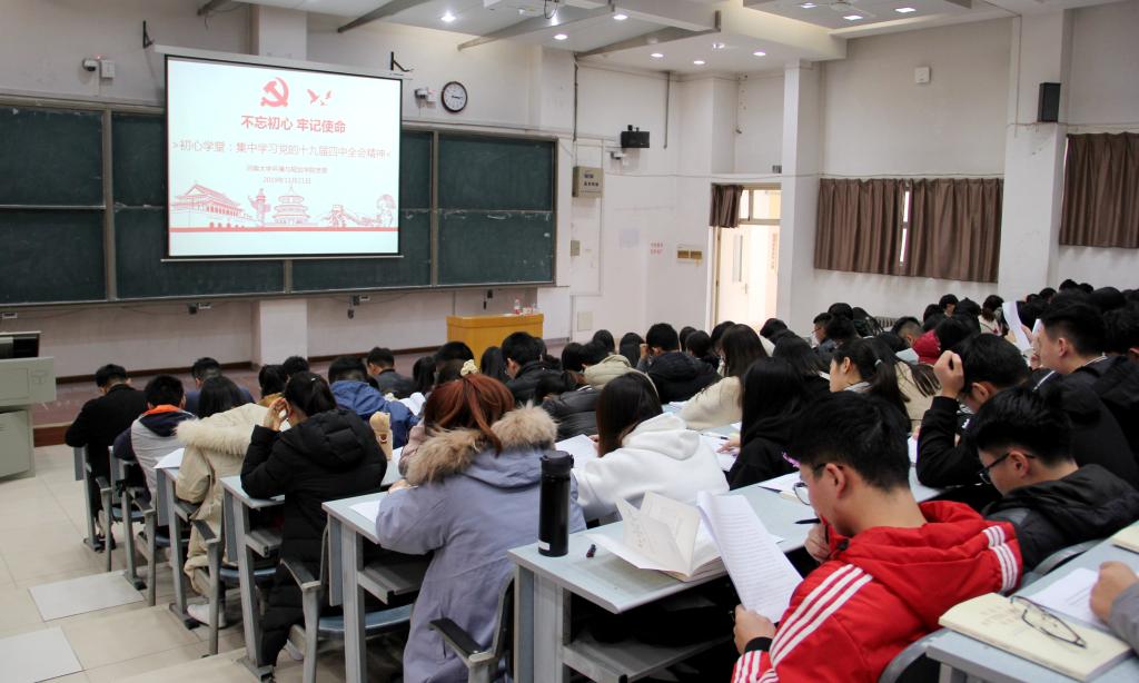 全体学生党员齐聚“初心学堂”,在综合楼1301室集体学习党的十九届四中全会精神。