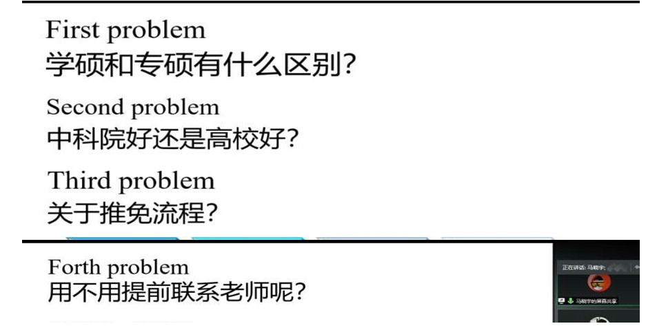 保研方面,马晓宇和苗永岚主要介绍了推免流程和分享了自身参加保研夏令营的经历,提供了一些是否提前联系导师与面试方面的经验和技巧。此外,马晓宇还就一些常规问题作出了解释,例如中国科学研究院和高校的区别、学硕和专硕的区别。