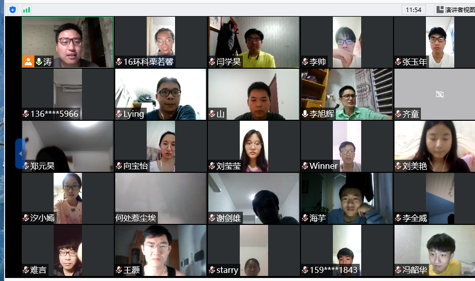 2020年6月4日晚上,环境科学专业线上考研经验交流会拉开帷幕。马晓宇、苗永岚作为保研代表,张云山、冯韶华、郑元昊等10名同学作为考研代表。此次进行交流的2016级学生进入不同的学校,他们有不同的考研保研经历,可以为17级学生提供多方面参考。会议由李涛老师和李旭辉老师主持。
