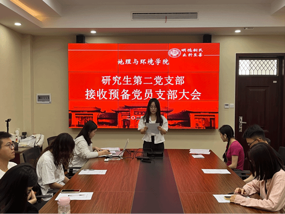 随后,研究生第二党支部召开接收预备党员支部大会。由陆蓉同志向全体党员及发展对象介绍了本次会议的基本流程,宣布本支部有表决权的正式党员共29人,应到会29人,实到会24人,有表决权的正式党员到会人数超过应到会有表决权人数的半数,会议生效。